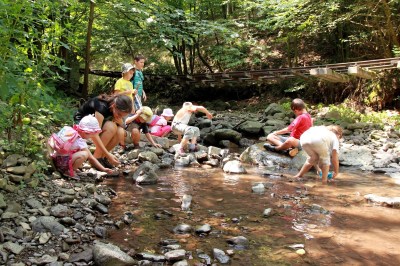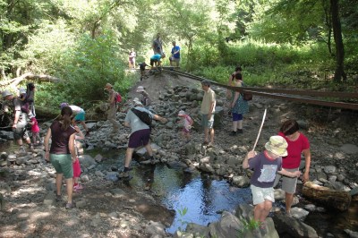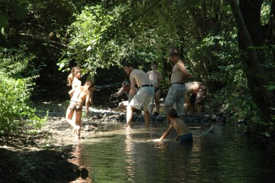 Három éjszakát, négy napot töltöttünk Bernecén a családos tábor keretei között. Mikor a városban negyven fok körül járt a hőmérő, ott fent a hegyek lankáin csak a déli tűző nap jelentett elviselhetetlen hőséget, még a tetőtérben is kellemesen lehűlt a levegő éjszakára. Különösen sokat enyhített a melegérzetünkön, hogy bármikor belegázolhattunk a kerítés mellett csordogáló patak vizébe. A gyerekek ezt előszeretettel tették meg naponta többször is, egy szál fürdőruhában, mezítláb! A legjobb hűsítő „munka” a gátépítés a patakon. Az apukák is élvezték a feladatot, hogy „vigyázzanak” az építkező csemetékre.