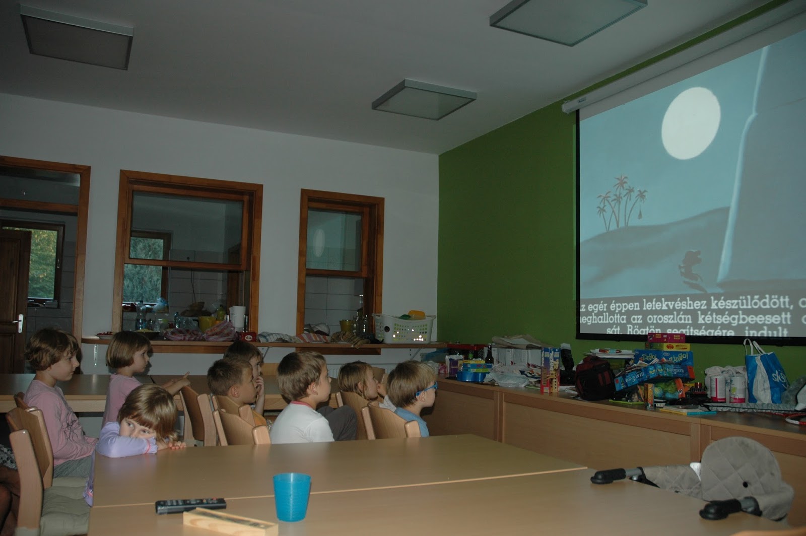 Esténként, kihasználva a ház adottságait, projektoros diavetítést tartottunk az aprónépnek.