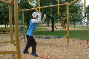 | Nyári kép: egy óvodás a Billegliget közepes nehézségű mászókáján |