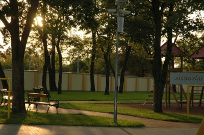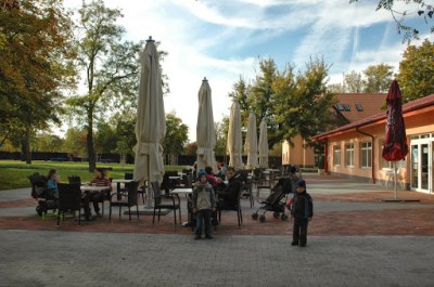 Őszre elkészült az igényes parkoló, sőt, negyven darab bicikli biztonságos lelakatolására is gondoltak a szép biciklitárolókkal a bejárat előtti kis téren. A büfé kínálata nem nagy, de pl. melegszendvicset, zsíros deszkát fogyaszthatunk, a capuccino finom volt, igazi tejhabbal készült. A büfé előtti asztalok és székek kulturált pihenést biztosítanak a kifáradt szülőknek, és ami nagyon pozitív: sok van belőlük, minden alkalommal volt szabad hely.