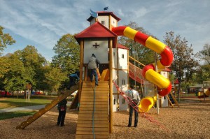 Júniusban a nyitás utáni héten elmentünk, hogy megnézzük a Tarzan Parkot, ezt a Magyarországon egyelőre még egyedülálló* szabadtéri játszóparkot. Két oka is volt erős kíváncsiságunknak: az egyik, hogy Újpesten nyílt, közel hozzánk, láthattuk az építkezést. Akárhányszor elhaladtunk előtte, a gyerekek vágyakozva nézték az épülő csodacsúszdákat. A másik ok pedig egészen személyes: a Tarzan Park egy korábban napközis tábornak használt, volt önkormányzati telken kapott helyet. Ezt a szép, ám az utóbbi időben kissé elhanyagolt, hatalmas ősfás területet olyan gyerekek részére tartották fenn nyarakon keresztül (még az én gyermekkoromban is), akiknek szülei nem tudták megoldani a nyári felügyeletet másként. Sok kerületi pedagógus vállalt el itt egy vagy több hetet, hogy minőségi felügyeletet biztosítsanak a rászoruló gyerekek számára. Most, hogy a területet más használja, a gyerekeknek korántsem jut már ilyen szép hely a nyári hetek eltöltésére. Nos, ezért voltam annyira kíváncsi, mit hoztak ide, ha már a nyári napköziseket kitelepítették…
