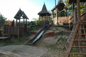 A térkép alapján könnyedén megtaláltuk azt a kitaposott utacskát (tábla nem jelzi), amely vadrózsa bokrok mentén levezet a játszóterek tisztásához. Már épp ideje volt, hogy uzsonnázzunk, és kislányom lekerüljön végre a hátamról. A Kicsik játszótere mellett fogyasztottuk el a gyümölcsöket és a kekszeket, itt gond nélkül engedhettük a gyerekeket szabadon játszani. A Kaland Játszótéren azonban nem árt a folyamatos és alapos felügyelet, mert ide magas várakat, drótkötélpályát és erődítményszerű mászóka-csúszdát építettek.