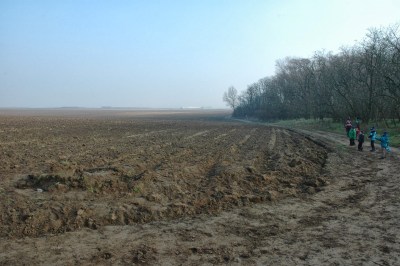 Az erdő mellett szántó (mögötte már az M0), majd kis séta után a nádas következett. A tanösvény megfelelő táblája természetesen a nádas élővilágáról is részletes ismereteket közöl. Néhol nagyon csúszik az ösvény eső után, erre figyelni kell.