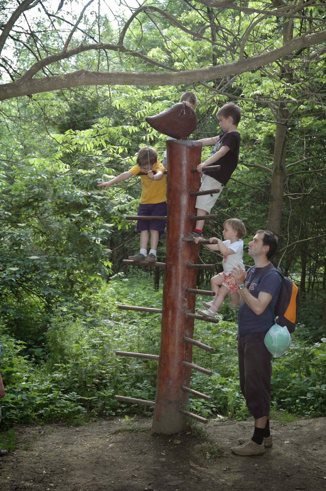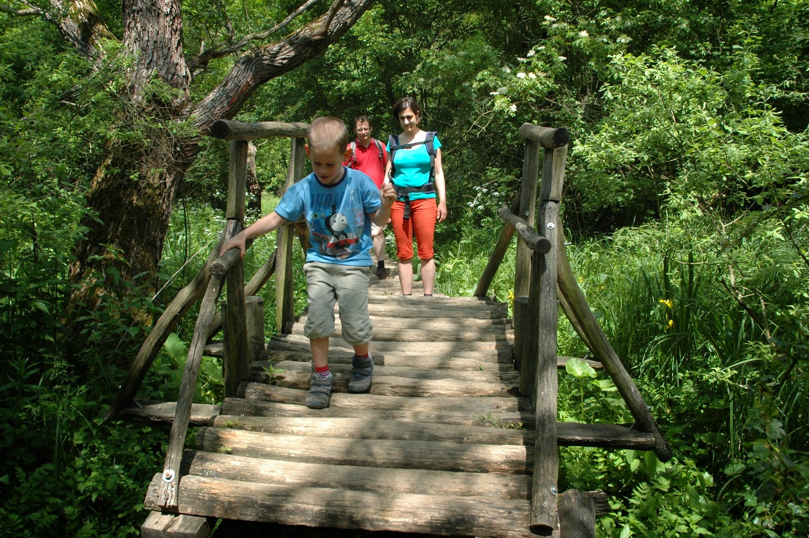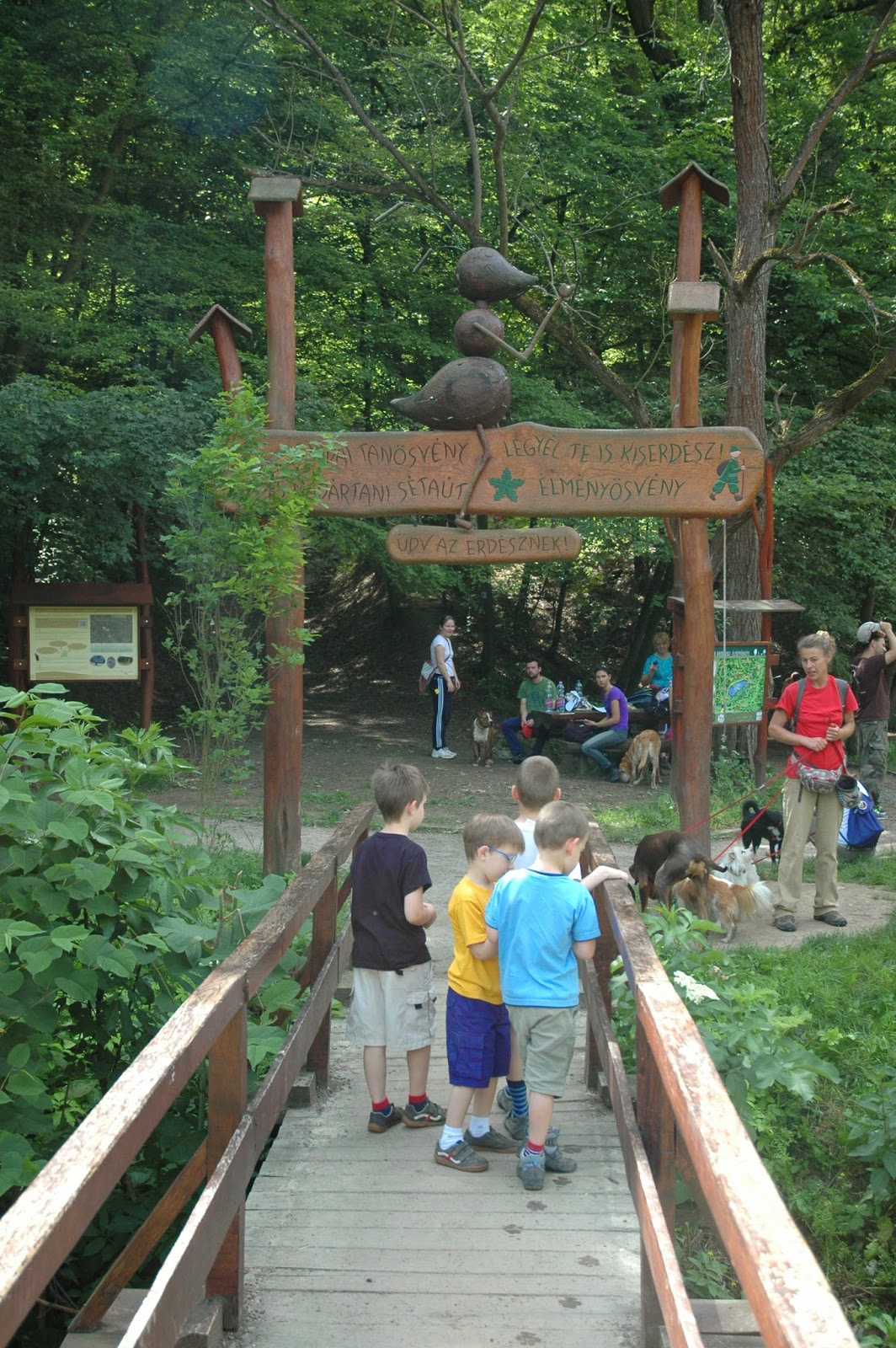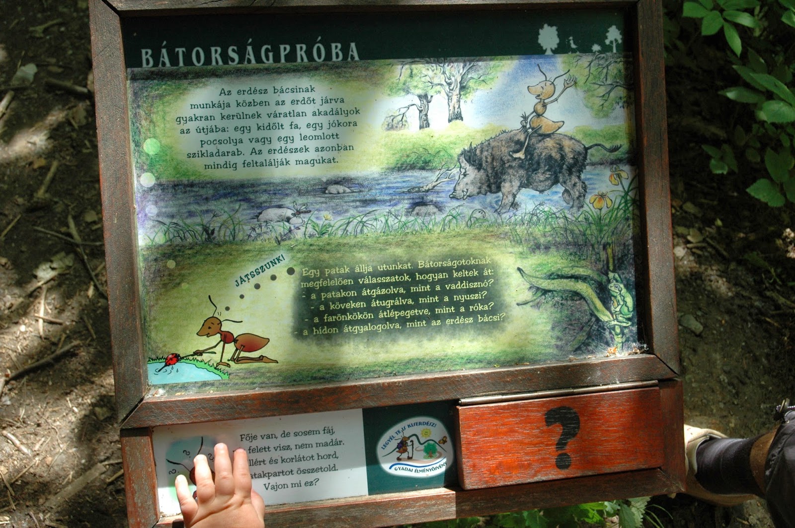 A változatosság ugyanis nem csak az időjárás szempontjából számít a legmegfelelőbb kifejezésnek, ha erre a májusi kirándulós napunkra gondolok. Gyadán van minden, amit 6 km-nyi kirándulásba bele lehet sűríteni: meredek kaptató, erdő, madárodúk, kőfejtő, saras útszakasz (tavasszal gyakran előfordul), gyönyörű rét, pallósor át a mocsáron, Óriások Pihenője (ahova pont ebédidőben érkeztünk), bodzabokrok, billenőhíd, újabb pallósor, patak, ismét erdő, függőhíd, nagy emelkedők és lejtők, és mindezt kíséri Hangya Dani akár otthon kinyomtatható feladatsora és érdekes szöveges-képes táblái a tansövényen.