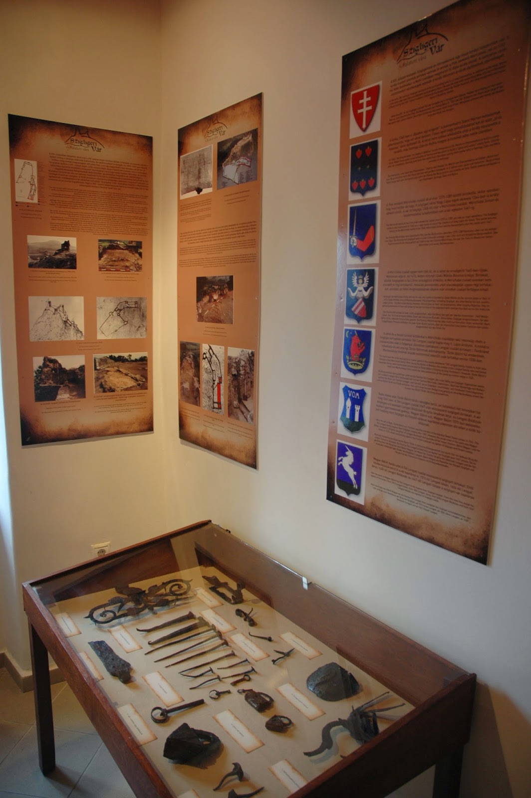 Nagy meglepetés volt számunkra a Várból lefele jövet megtalálni a szintén a Várhoz tartozó kiállítást, ami lent, a parkoló és a templom mellett található házban került kialakításra. Az egész teljesen ingyenes, és nagyon érdekes. Sok apró régészeti lelet mellett találunk itt cserépkályha rekonstrukciót: valami gyönyörű! A teremőr hölgy beindított nekünk egy kb. negyedórás filmet a Vár történetéről, tulajdonosairól, az építkezések alakulásáról. Csodálatos látványtervek, lenyűgöző grafika HD minőségben – belegondoltam, hogy a gyerekeim, kb. a második percben unták volna meg. Kettesben viszont végig tudtuk nézni!