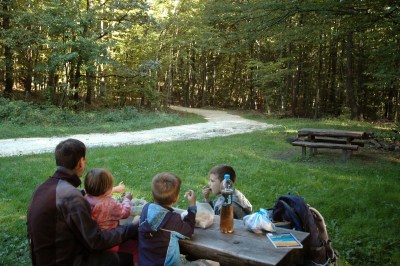 Hogy ne zavarjuk a szeánszot, meg ők se minket, továbbsétáltunk a piros körtúra jelzésen (neve: Zsivány körút :)). Itt szinte rögtön egy nagy rét fogadott minket, pihenőhelyekkel. Ideje volt elfogyasztani uzsonnánkat!