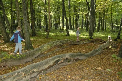 | Erdei akadálypálya egy kidőlt fa törzsén. |