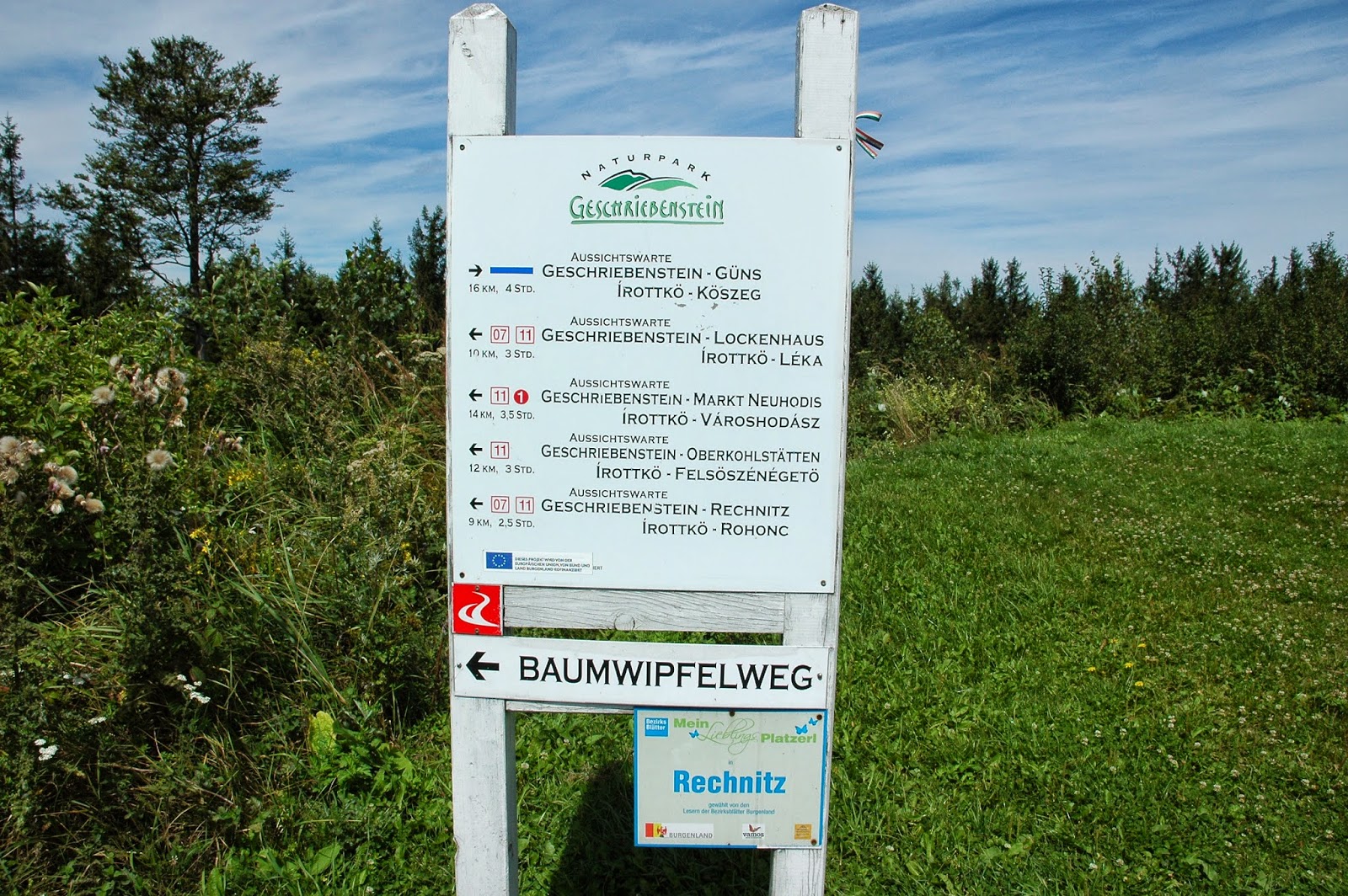 Írott-kő a környékhez képest nagyon magason fekszik, és a kilátó fele, igen, FELE már Ausztriában található. Kicsit keserédesen nevettünk is azon, hogy az osztrák oldalra szép, ápolt út visz fel, gyönyörű információs táblák olvashatók, vannak pihenőpadok, stb., míg a magyar oldalon semmi…