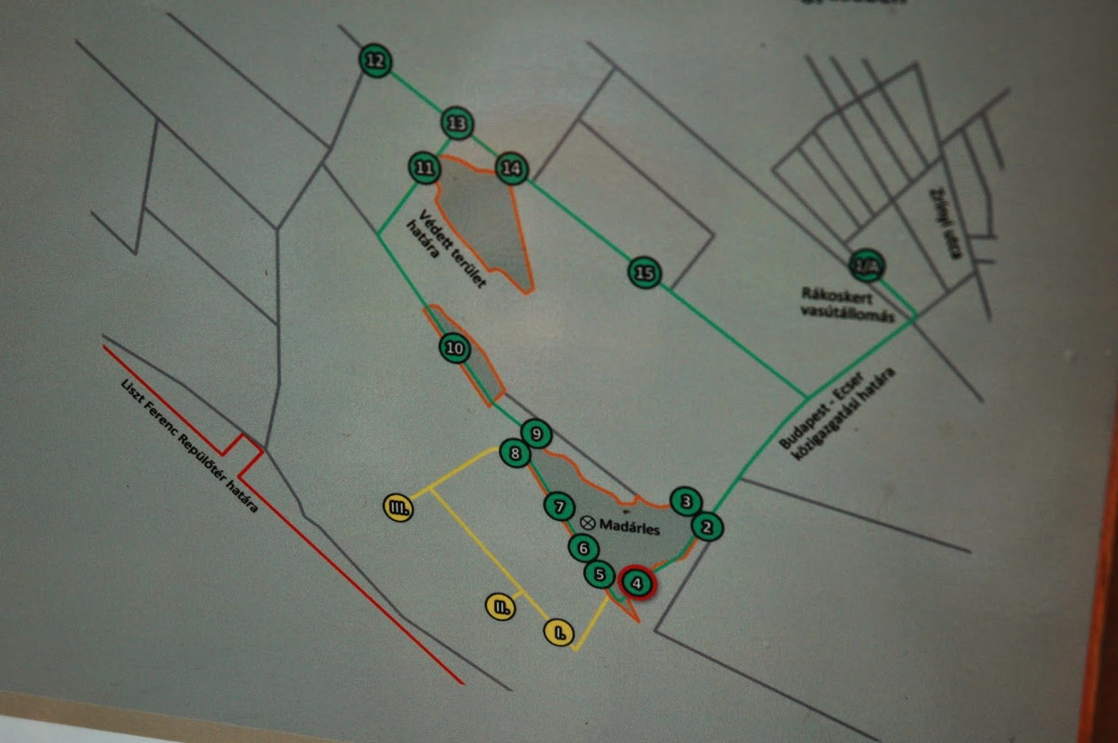 Ezen térkép alapján jól látszik, hogyan rövidítettünk, mert a gyerekeken láttuk, hogy nagyon fáradnak: a 9-es táblától egyből a 3-ashoz sétáltunk, nem tettük meg a nagyobb kört. A sárga jelzések nem tudom, mi célt szolgálnak, mi a zöld pontok szerint haladtunk. A rövidített séta megállásokkal, táblaolvasásokkal, nézelődéssel majdnem másfél óra volt.