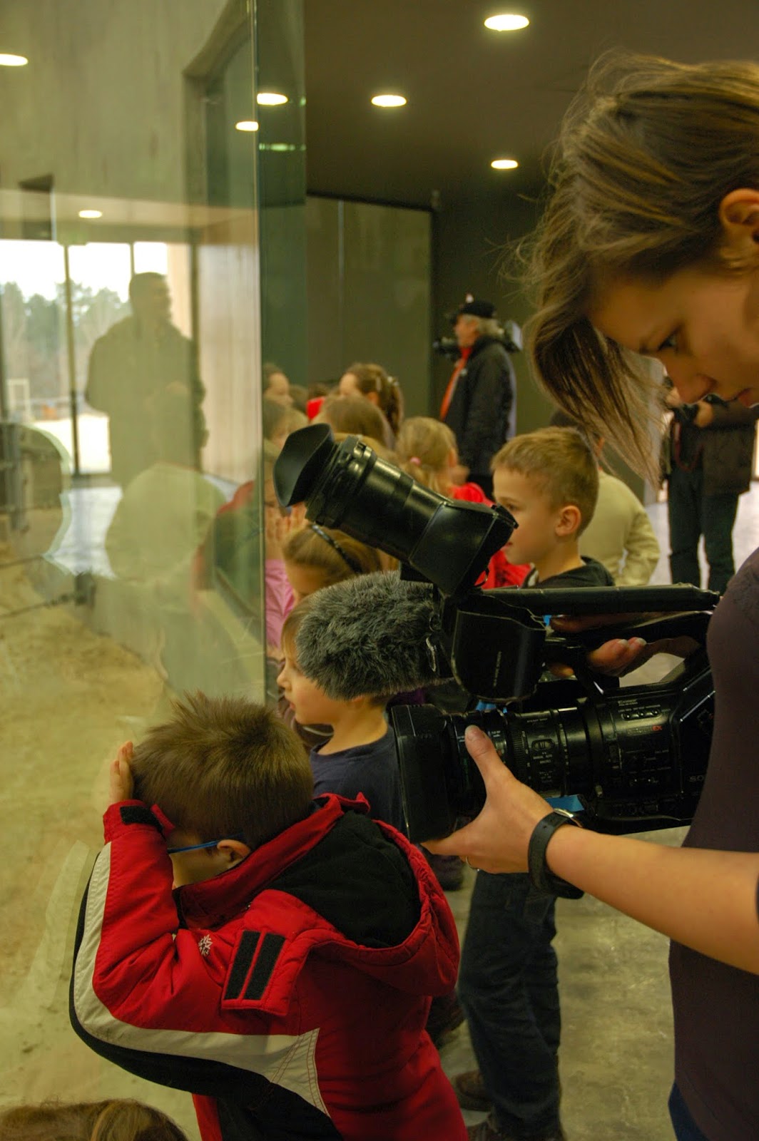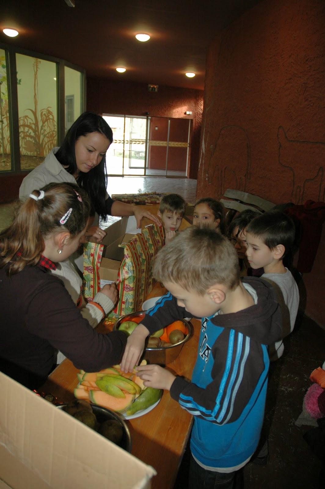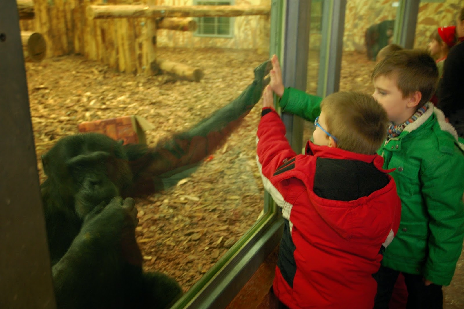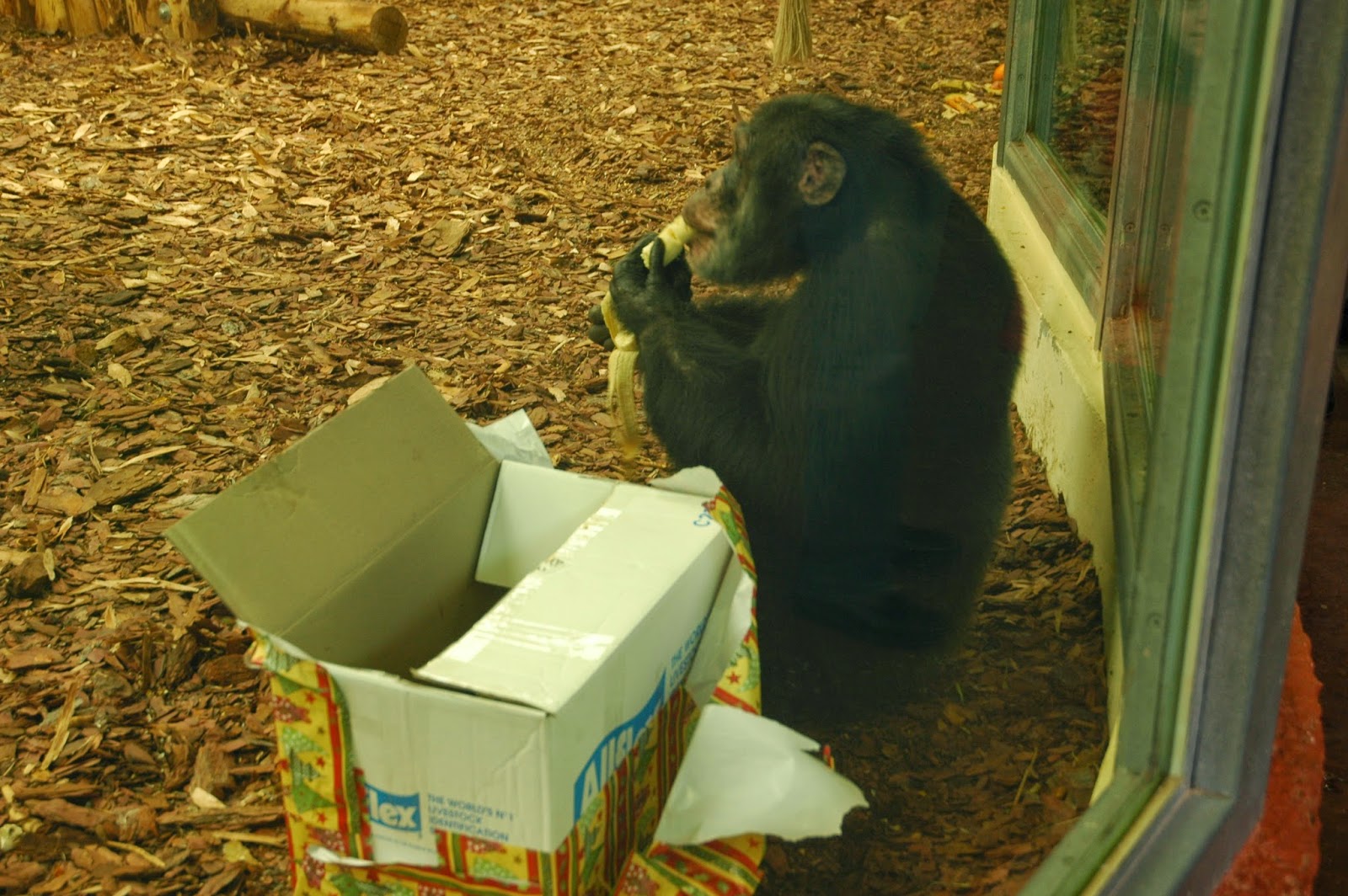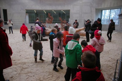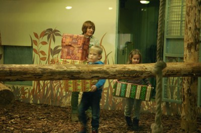 Az igazán különleges élmények az új részben vártak ránk. Úgy, hogy nem is tudtunk róluk! Annyit láttunk ugyan, hogy egy osztálynyi gyerek elviharzik mellettünk néhány felnőtt és egy rakás csomagolópapír kíséretében, de elképzelésünk sem volt, hová sietnek ennyire. A Csimpánzházban megtudtuk. 🙂 A Veszprém Zoo-ban szokás, hogy egy osztály minden évben megajándékozza a csimpánzokat – és idén már az elefántokat is – finomságokkal, karácsony alkalmából. Idén voltunk olyan szerencsések, hogy a véletlen folytán részt vehettünk ezen az eseményen! Mivel az osztályon, és a számunkra váratlanul megjelent sajtón kívül mi voltunk az állatkert egyetlen vendégei, mindenbe bevontak minket, mindenben részt vehettünk.