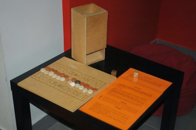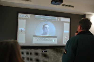 Az alagsor nagytermében négy különleges játékot próbálhatunk ki. Az alábbi képet egy olyan játékról készítettem, ahol a pontokat akkor kapja a játékos, ha sikerült neki megfelelő ruhadarabokkal felöltöztetni az adott embert (katona, kereskedő, stb). A ruhákhoz információ olvasható, és ezek alapján lehet dönteni, de mivel az idő is számít, érdemes gyorsan olvasni. 🙂 Én magam a DOMUS játékot próbáltam ki, ahol egy római házat kellett berendezni a megfelelő, odaillő használati tárgyakkal. A slusszpoén az egészben, hogy ezek a játékok a Wii-re hasonlítanak talán a leginkább, tehát a testünkkel irányítjuk a mozgásokat, nincs eszköz.
