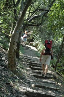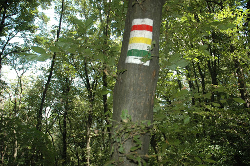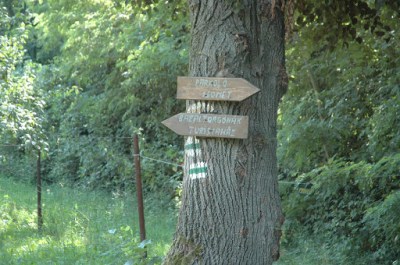 A parkolótól kicsit visszafelé megtaláltuk a sárgát, amit a könyv írt. Az is segített, hogy erre kint volt egy tábla, hogy ” Turistaház”, ami azért volt reményt keltő, mert a kulcsosház érintése szerepelt a túraleírásban is. Elindultunk hát ezen. Csodálkoztunk, hogy a fákon egyszer sárga, egyszer zöld jelzések voltak… majd a sárga hosszan eltűnt. Mígnem újra előkerült! Örültünk neki, szépen el is mentünk rajta jobbra, hiszen a sárga nyíl arra mutatott, a könyv meg azt írta, hogy szépen haladjunk csak a sárgán. Egy idő után kezdett gyanús lenni, hogy ez a sárga ösvény nem biztos, hogy jó lesz… Szűk, susnyás szakaszon vezet, alig-alig látszik az út, és ami még elkeserítőbb volt: mentünk újra lefelé! Egy idő után a jeleket is alig láttuk a fákon. Aztán nagy nehezen, a hat gyerekkel lekeveredtünk egy nagyobb útra. Ami olyan ismerős volt. Persze, mert tettünk egy teljesen értelmetlen kört, és ugyanoda visszaértünk, ahol fél órája már jártunk.
