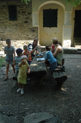 | Pihenő a régi turistaház előtt. |