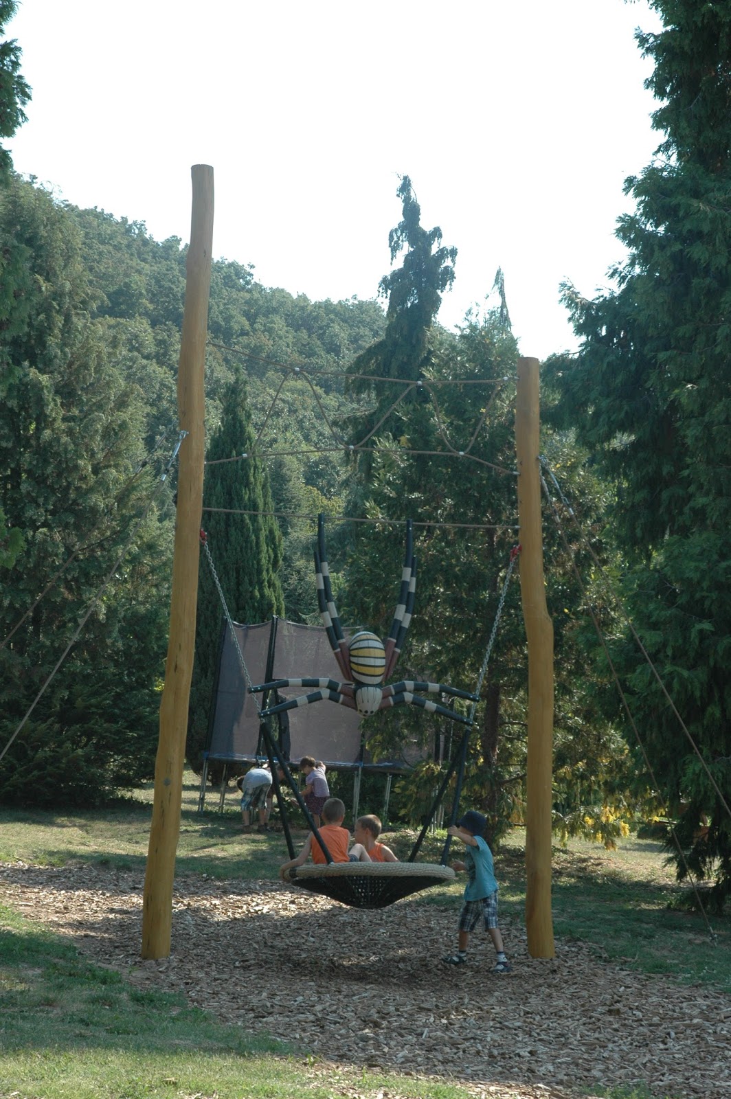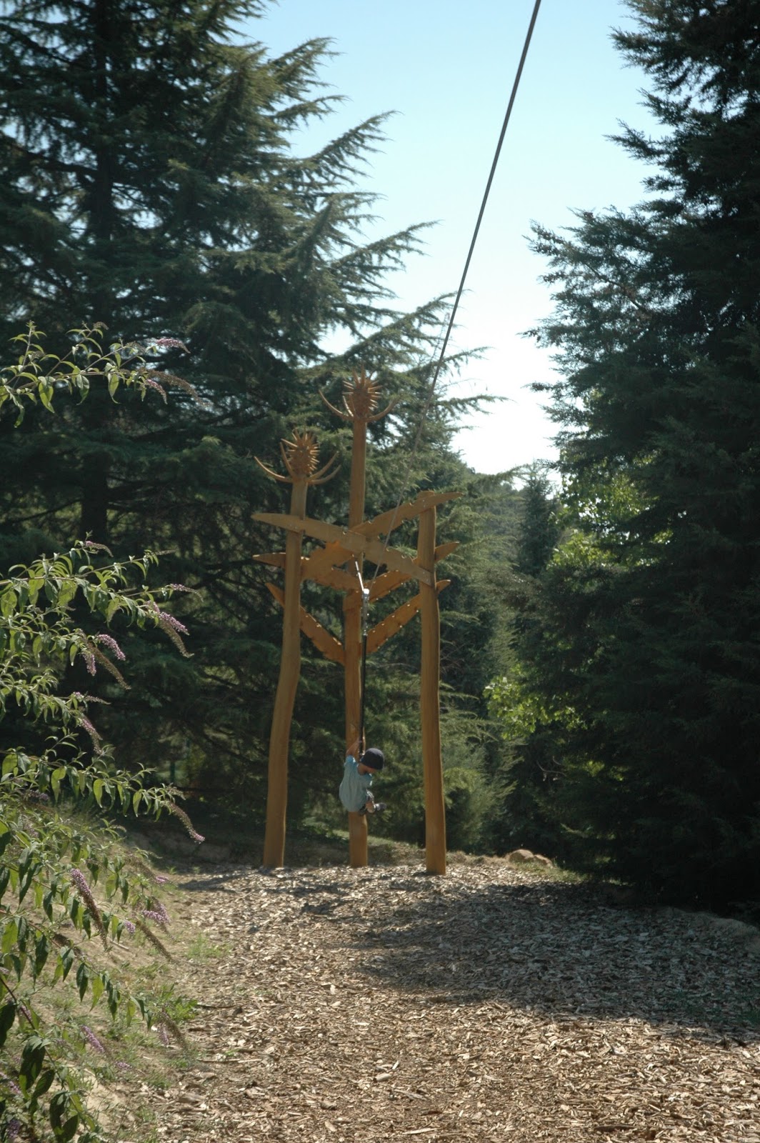 Mert abból indultam ki, hogy egy arborétumban lehet ugyan rohangálni, lehet ugyan nézelődni, de azért alapvetően a srácoknak ez a program sokkal inkább egy parki élmény, egy erdei séta, mint játszótéri örömködés. A Folly Arborétumban azonban egy pályázat során nem csak a sétautak, és a vendégfogadó épület újult meg, hanem kilátó és gyönyörű, igényes fa játékok is épültek. Szépek, igényesek, öröm rájuk nézni, öröm itt sétálni!
