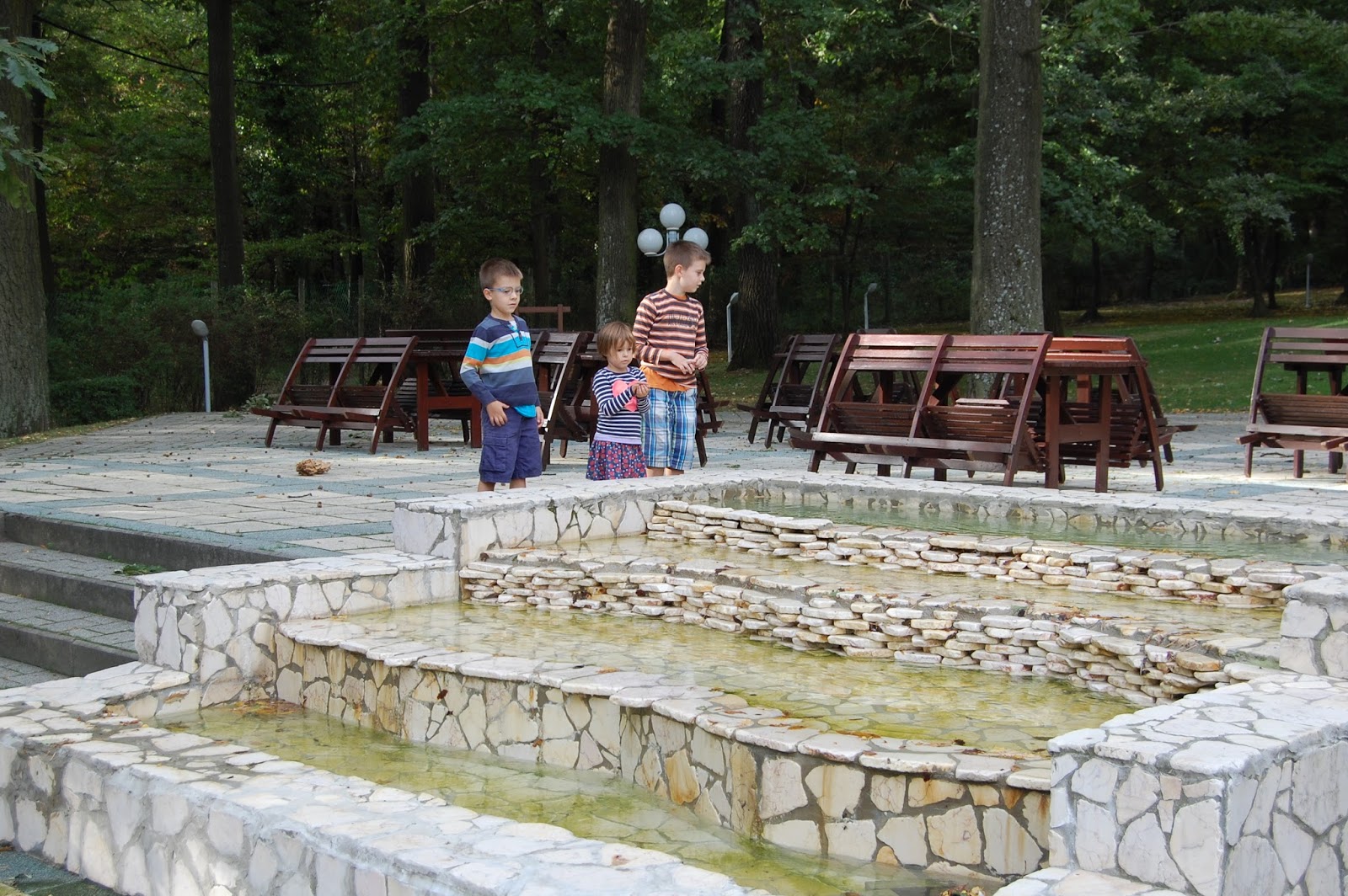 | Kalandok a hotel kertjében. Fáról fára ugráló mókusok, termésgyűjtés, szökőkút. |