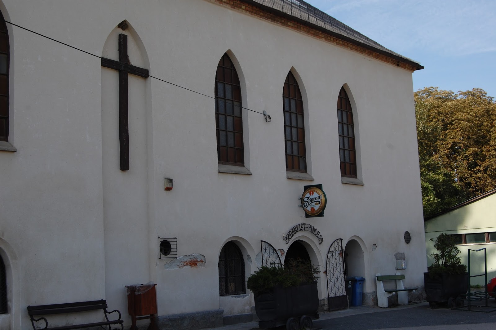 A csodálatos helyszínen elköltött finom ebéd után, amiről majd legközelebb fogok részletesen írni, bevetettük magunkat a Soproni-hegység mélyebb bugyraiba. Először is szerettem volna élőben látni, hogy tényleg létezik olyan, hogy kocsmatemplom? És igen, létezik! Pénteken délután Brennbergbányán ugyanabban az épületben mindkét műintézmény nyitva volt.