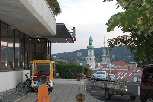 | Ezen a képen talán létszik jobbra az a hatalmas bicikliszállító utánfutó, amely német nyugdíjasok saját kerékpárját szállította Sopronig. A Hotel főbejárata előtt áll. |