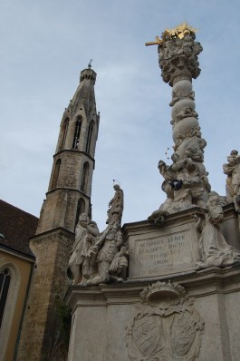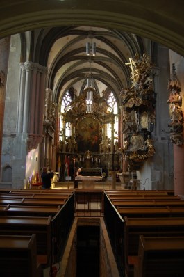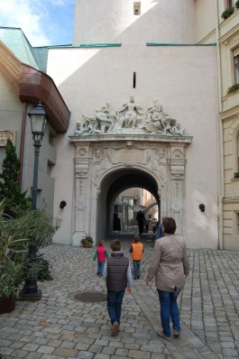 A vasárnapi szentmisén a Kecsketemplomban vettünk részt. Innen tényleg szó szerint egy lépés a Belváros, hiszen annak szívében, a Fő téren található. A Kecsketemplom 9.00-es miséje korán kelő családunknak nagyon megfelelt mind helyben, mind időpontban, de annyit azért elmondanék a helyet nem ismerő famíliáknak, hogy az egyenként lehajtható ülőkék igen nagy kísértést jelentettek a gyerekeinknek az egész mise ideje alatt… 🙂 A Kecsketemplom hangulatáról, művészettörténeti és történelmi érdekességeiről most nem írok hosszabban, hisz ezek az információk az útikönyvekben is oldalakat töltenek meg.