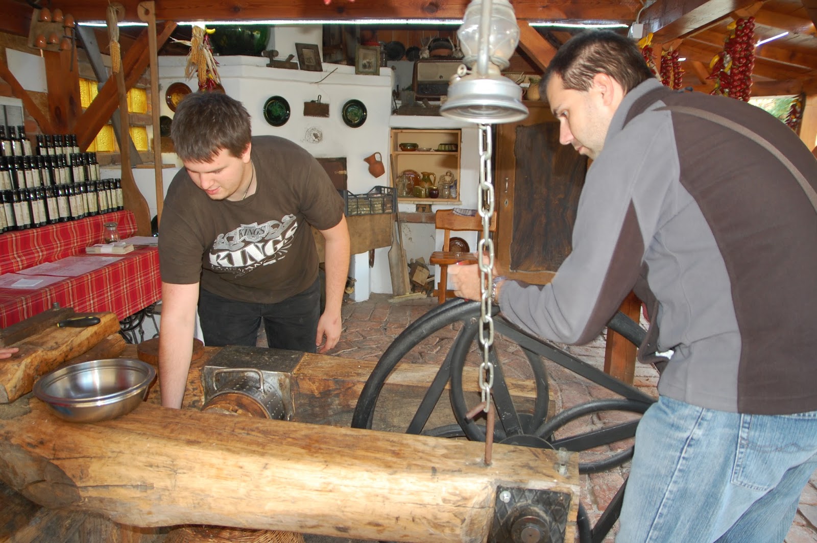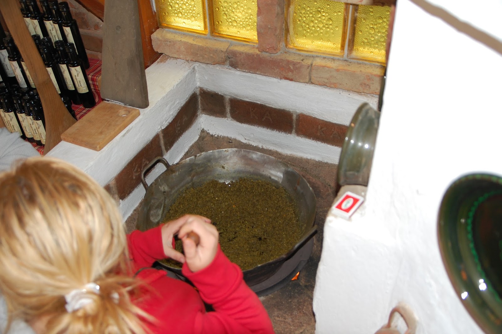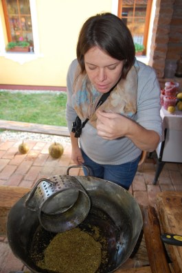 A Batha Portán 17.00-ra vártak minket, és úgy volt, hogy egy csoporttal együtt lesz a bemutató. Az egész busznyi csoport azonban lemondta, és amikor ott toporogtunk néhány perccel öt előtt az udvaron, mi sem volt természetesebb házigazdáink számára, hogy nekünk azért megtartják a kóstolót. Így alakult, hogy férjemmel kettesben hevítettük a tökmag darálékát, majd férjem sajtolta ki belőle az olajat! Még soha nem láttam ilyet élőben, ezért részese lenni a folyamatnak nagy élmény volt. (Ekkor még nem tudtuk, hogy az általunk sajtolt olajat és a maradékot megkapjuk ajándékba.)