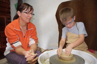 Először megtekinthettük, miként alakul a korongon egy darab agyagból a tál, majd a díszítéssel a kuglófsütő. Utána kisfiam próbálhatott szerencsét. A “kis” segítséggel korongozott darabot aztán haza tudtuk hozni, jelenleg fazekas barátunk égetőkemencéjében vár a sorára.Czúgh Zsuzsanna műhelyét a falu Bajánsenyéhez közeli végén találjátok, a Fő utca 21/a szám alatt. Előzetes bejelentkezéssel korongozási lehetőséget biztosít. Ha részleteiben érdekel Benneteket a magyarszombatfai fazekasság története, látogassátok meg a Fazekasházat!