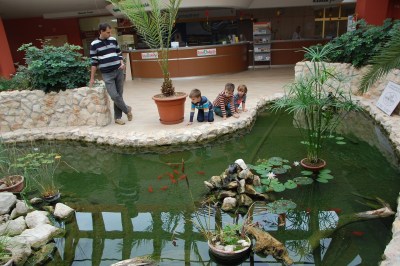 Ettől a helytől tényleg csak pár lépés séta a szentgotthárdi fürdőkomplexum, teljes nevén a St. Gotthard Spa &Wellness. Az épületegyütteshez ma már egy szép szálloda is tartozik. Mi a fürdő aulájának éttermébe voltunk hivatalosak. Míg vártunk az ételünkre, a gyerekek az aula tavacskájában úszkáló halakat figyelgették, lépcsőztek és vágyakozva tekintgettek a fürdő medencéi felé a hatalmas üvegablakon át. Nem volt nálunk fürdőfelszerelés – az Őrségbe nem vittünk – és sajnos időnk sem lett volna a lubickolásra, hiszen utunk hazafelé így is több mint négy órásra sikerült. Persze megígértették velünk, hogy eljövünk ebbe a fürdőbe, hogy kipróbáljuk a beltéri csúszdákat és az élménymedencéket. A fürdő étterme igazán igényes, nagyon finom ételeket kaptunk, viszonylag gyorsan, mert nagy tömeg nem volt. A fürdő beltéri gyorsétterme a pincér leírása szerint egyszerűbb ételeket kínál, de aki igényes, igazi éttermi ebédet szeretne, kijöhet fürdőköntösben az aulába – épp ebédelt is egy fürdőruhás család kint – és ehet egy jót, utána szabadon visszamehet fürdőzni, pihenni.