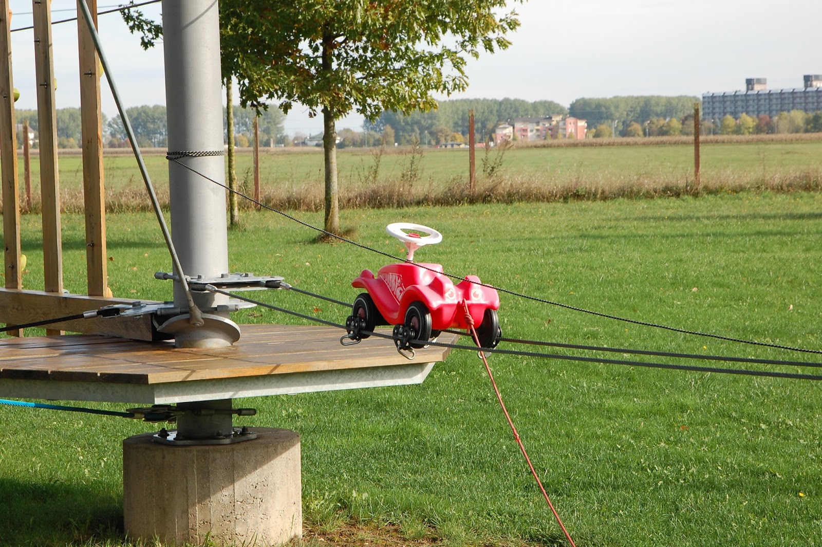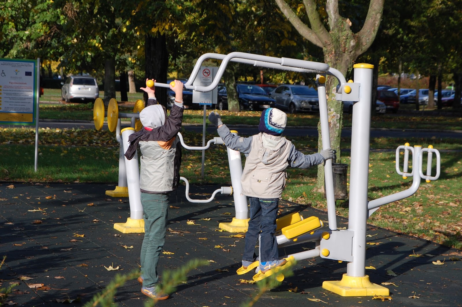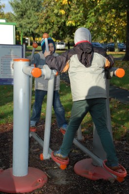 A gyerekek majd’ kiugrottak a bőrükből örömükben, és bevallom, mi sem voltunk a bringázás ellen. A nap kisütött, én kaptam egy pocakkal is könnyen tekerhető, ráadásul akkumulátoros járgányt, semmi kifogásunk nem lehetett, és nem is volt, hogy útnak induljunk. Kinevezett helyi idegenvezetőnk, Marci először a szomszédos játszótérre vezetett minket. Sajnos a játékok kissé vizesek voltak, de a gyerekeket kárpótolta a játszótér mellett található tornapálya eszközeinek kipróbálása.