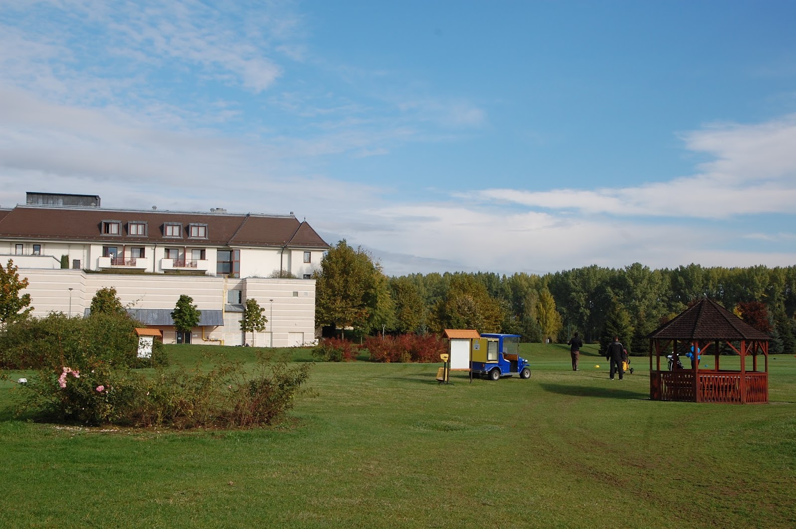 Innen négycsillagos hotelünk kertjébe tekertünk be, ahol egy kis dombon áll Bubo Lignis, azaz Fabagoly. Őt nem csak azért látogattuk meg, mert nagyon aranyos kis figurája Bükfürdőnek, hanem azért is, mert a dombocskáról, ahol áll, igen jó kilátás nyílik az ún. “green-re”, azaz a golfpályára. Ha nem is a Greenfield Hotelben szálltok meg, érdemes ellátogatnotok ide, tényleg nem mindennapi látvány a golfpálya és a rajta gyakorló golfosok sora.