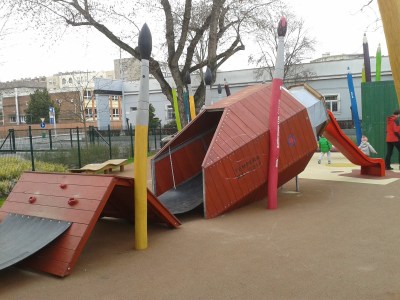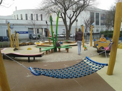 Autóval érkeztünk, a közelben számos, sajnos fizetős parkoló közül válogathattunk. Erre, mármint a precíz fizetésre érdemes nagyon figyelni, mert a parkolóőr folyamatosan ott járkált körbe-körbe. A játszótér egyik bejárata a Bessenyei utcára esik, itt is lehet parkolni, a Pappas Autó épületével szemben. Kellemes tavaszi időnk volt, s a szünet ellenére sem kellett túlzsúfolt játszótéren tülekednünk. Most, hogy a tavaszi napsütés még igazán kellemesen simogatta testünket-lelkünket, nem kellett arra figyelnem, hogy hova húzódjunk az erős napsütés elől. De ez a játszótér a nagy nyári melegekben bizony csak korlátozottan használható, mivel kevés közelében az árnyékot biztosító nagy fa. Ez, s még a hiányzó mosdó az egyetlen negatívum, amit el tudok mondani erről a fantasztikus helyről!