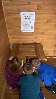 Az erdőben elrejtett jeleket memorizálni kellett – a gyerekeinknek ez meglepően jól sikerült – és a kis kirándulásról visszatérve a Geopark központi épületében melegedve a emlékezetünkből előhúzva kellett a válaszokat megadni. Ezután megkaptuk, hogy mely (általunk megtalált) számokból áll össze az a négyjegyű kód, amivel ki lehet nyitni a házban található kincsesládát. Amiben persze volt kincs!!! A játék minden pillanatát élvezték a gyerekek! És mi is… gyönyörű helyeken jártunk, és a srácokat a gyaloglásban kifejezetten motiválta a viszonylag gyakran egymást követő “állomások” sora.