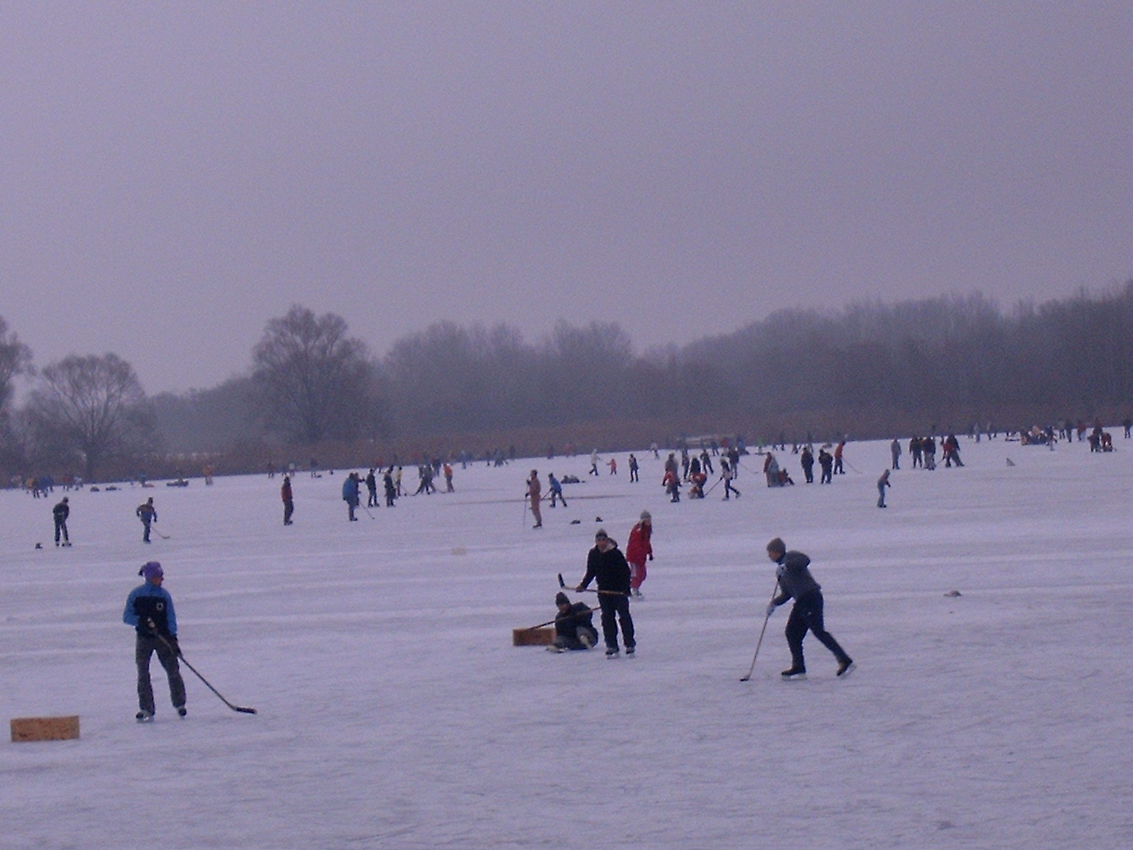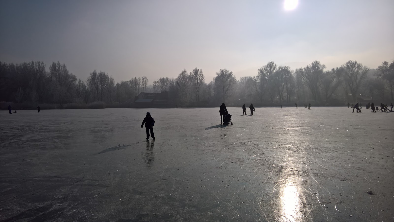 A jégpáncél vastag volt (félős vagyok, de itt nem féltem), a helyiek aktívan hokiztak, bátran átkoriztak egyik oldalról a másikra.