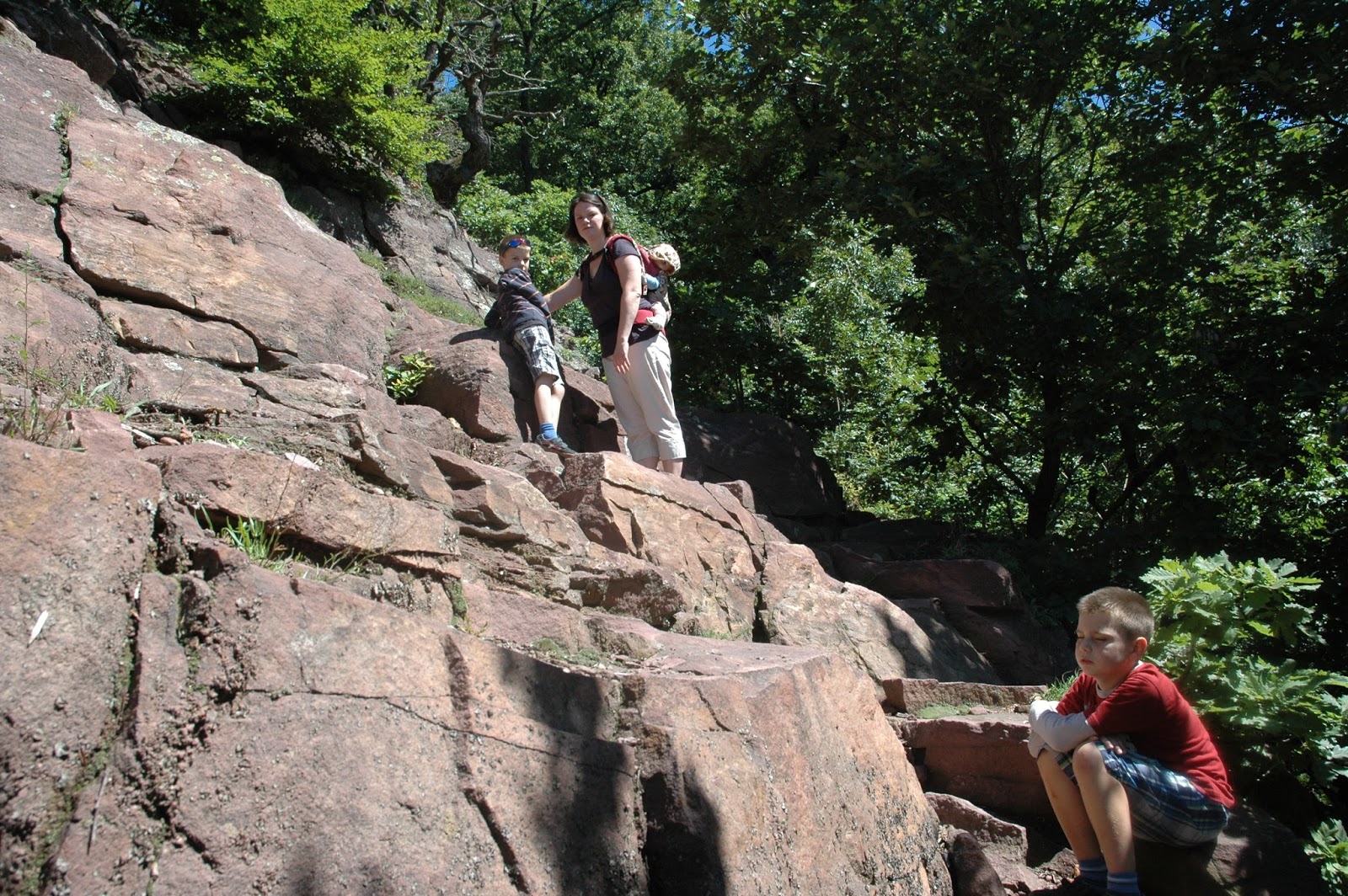 | A Sasfészek nevű elhagyott kőbányán át vezet az út felfele. Igen. A kijelölt “úton” haladunk, a kisfiam erőt gyűjt az “út” alján, a teteje felettünk nem látszik! MÁSZNI KELL! |