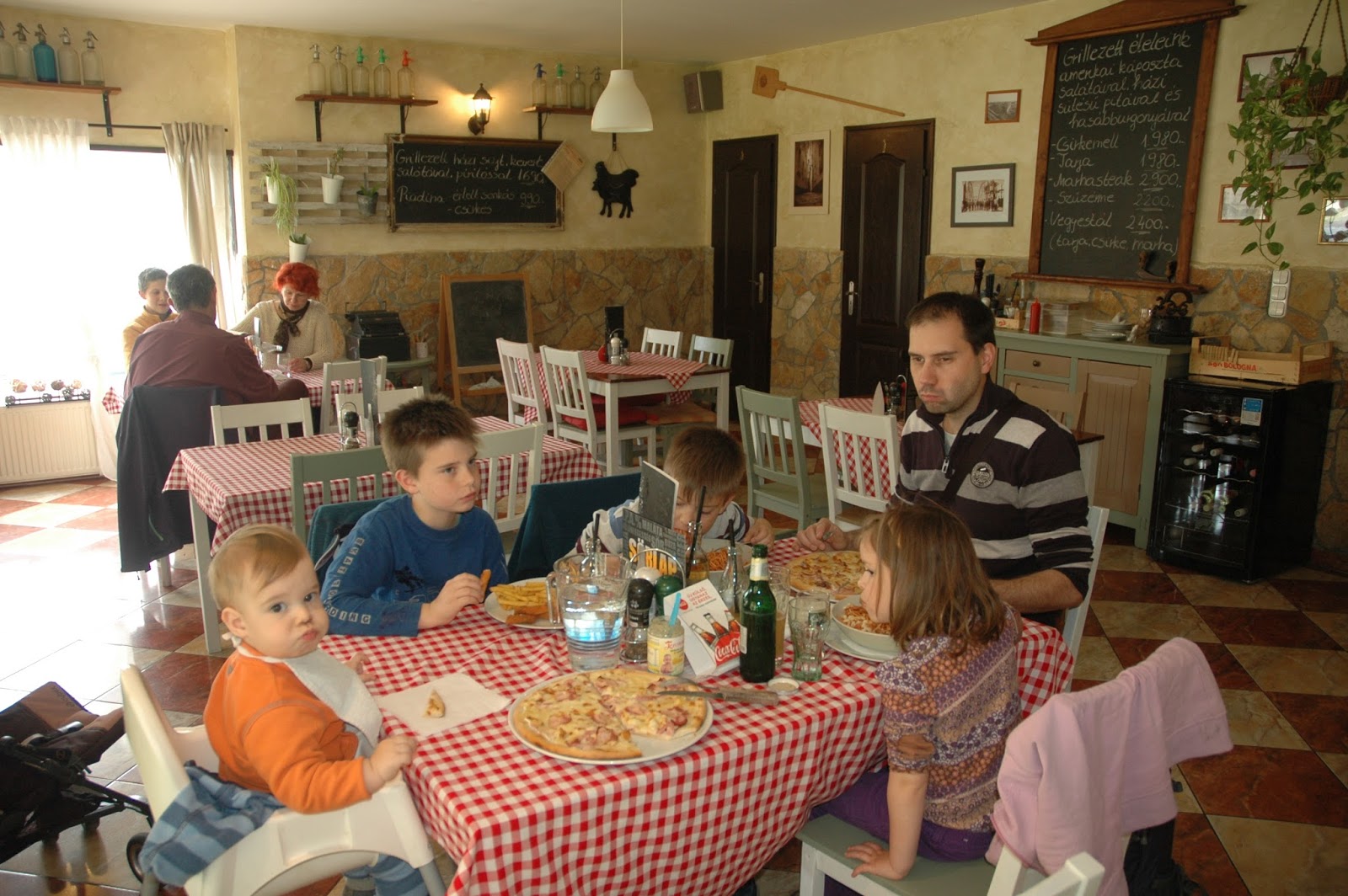 Ha szeretitek a halat és a gyerekek is megeszik – vagy esetleg palacsintával megelégszenek – akkor akár a Hajóskanzenben is tudtok meleg ebédet enni, fedett teraszon. Mi viszont pizzát ígértünk a srácoknak, és Komáromban találtunk olyan pizzériát, amit árban és minőségben is megfelelőnek ítéltünk.