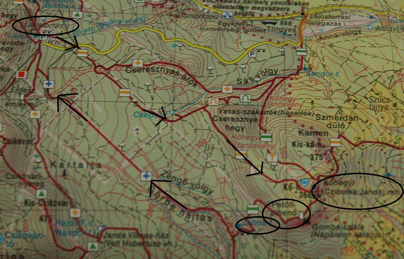 Visszafelé, hogy ne legyen unalmas, másik útvonalon jöttünk: a zöld jelzésen indultunk el, a Petőfi-pihenő felé, megnéztük a Gomba-sziklát, elhaladtunk a János-forrás mellett, majd rákanyarodtunk a kék keresztre, amely hosszan, egyenesen vitt fel a Lajos-forrásig (csak az utolsó pár száz méteren csatlakozik bele a sárga keresztbe)
