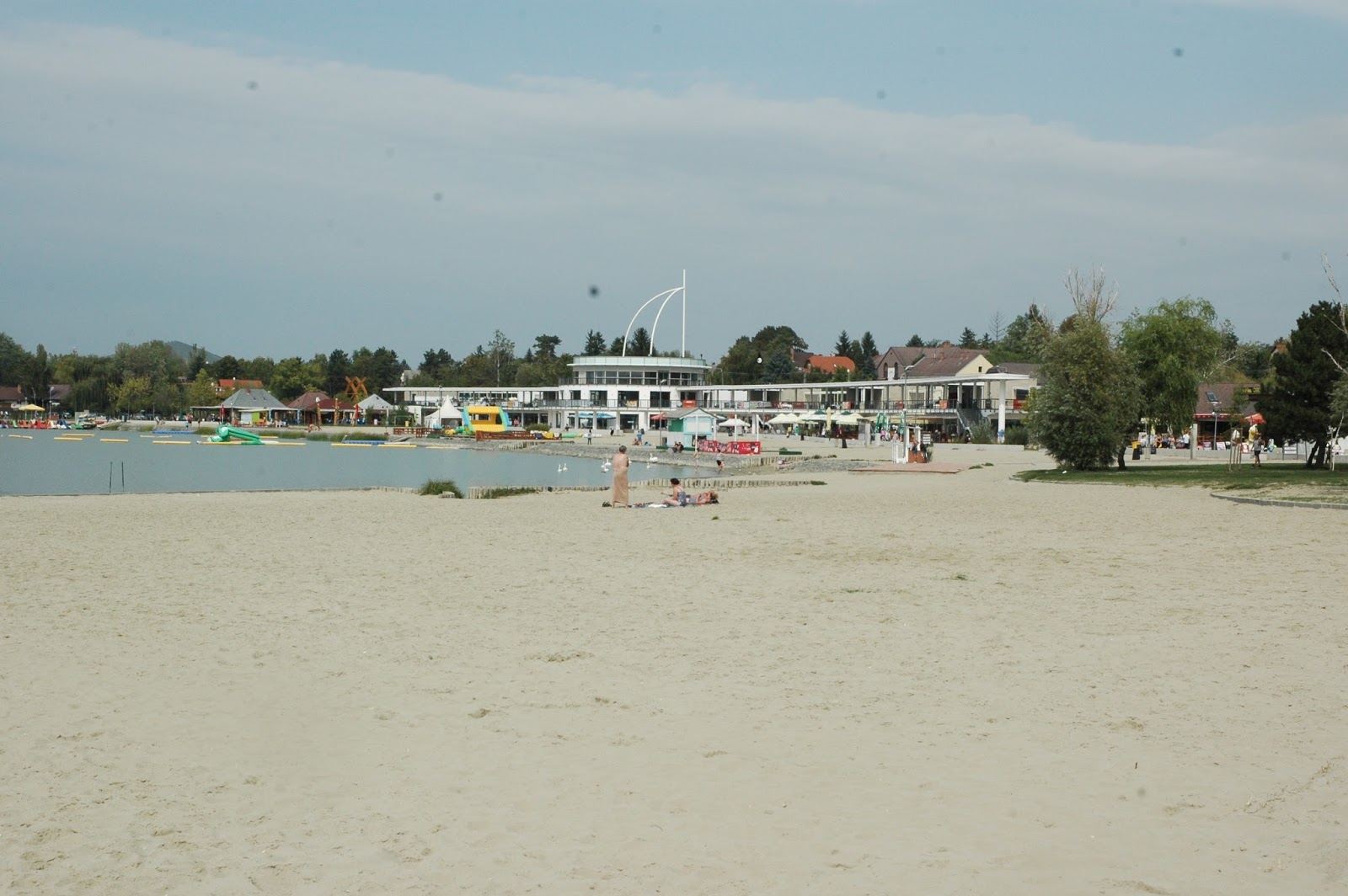 Van egy másik játszótér is, a retró szálláshely mögött (ami most osztálykirándulókkal volt teli), ott, ahol a “plázs” kezdődik. A velencei homokos parton sétány vezet végig egészen a modern épületig, amiről nem is tudtuk hirtelen eldönteni, hogy mi is valójában: egy bevásárlóközpontba oltott strand főépület? Azt hiszem, így tudnám legjobban jellemezni a Velence Korzó hatalmas terjedelmű tömbjét ott a parton terpeszkedve. Van benne Spar, Rossmann, Decathlon, és egy csomó másik kisebb üzlet, de minek? És mi keresnivalójuk van közvetlenül egy parti épületben, szervesen a strandhoz csatolva? Rejtély számomra… de ha valaki tudja, írja meg nekem, mi volt itt a koncepció, és mennyire jött be, tényleg érdekel.