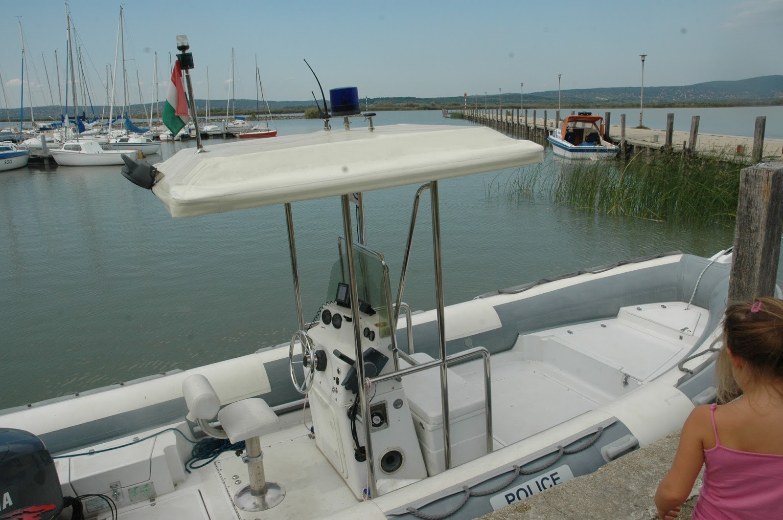 | Kikötő: Police feliratú motorcsónakok. Hosszú ideig nézegettük őket. |