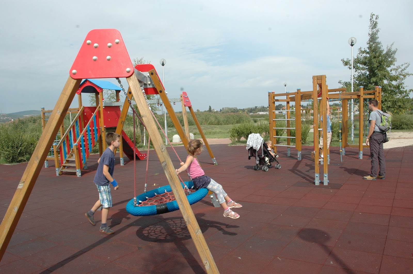 Ezután tovább sétáltunk az ökopark felé, ahol egy szép, de teljesen árnyék nélküli játszótéren tombolhatták ki magukat a srácok. Nyáron napközben ez a játszótér gyakorlatilag használhatatlan lehet, annyira semmi árnyék nincs. Minket ez most nem zavart, hiszen a szeptember eleji kellemes időben már kifejezetten jól esett a napsütés.
