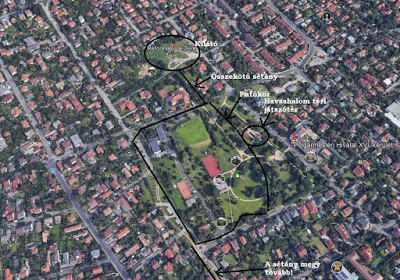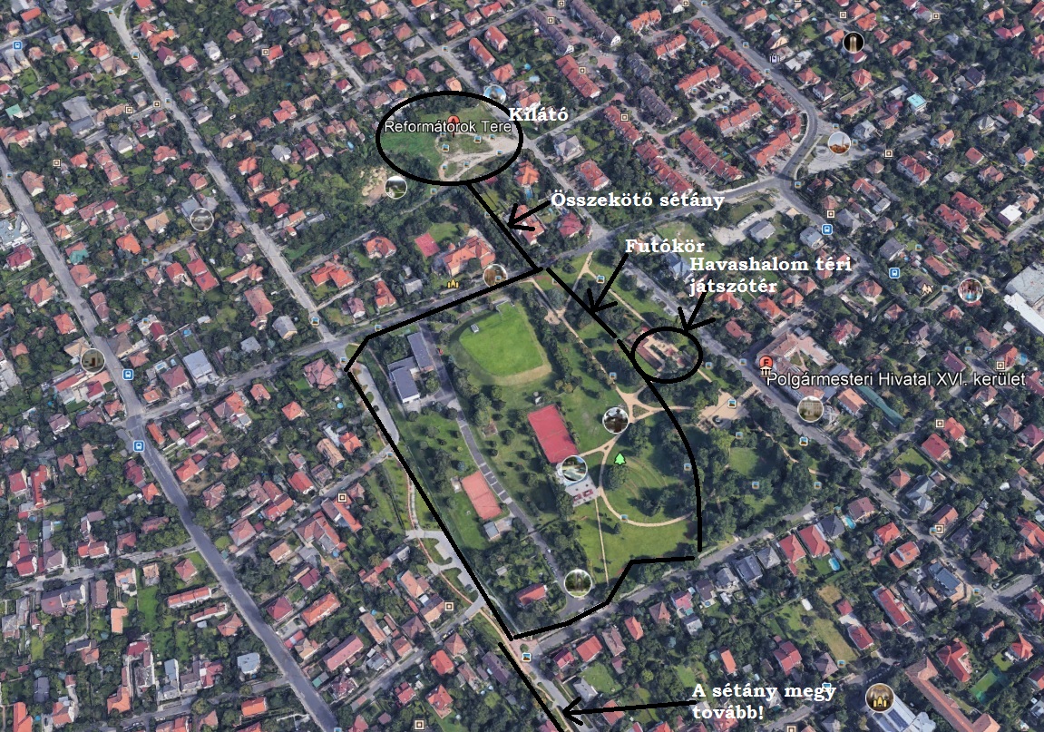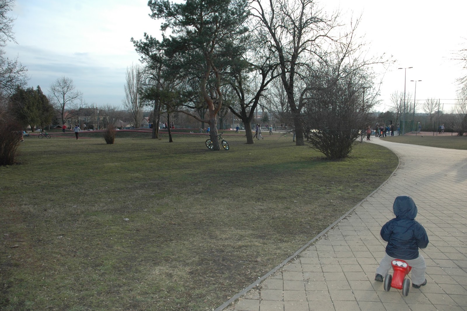 A futópálya melletti sétány kissé becsapós, mutatom mindjárt alul a térképen, hogy miért. A gyerekeink itt rollereztek, körbe-körbe, jól el is fáradtak. A nagyok sok kört mentek, együtt, közben jól megismerték a terepet. De az egyik kicsi (6 éves kisfiú) csak a végén kapott kedvet a rollerezéshez, és az utolsó körre becsatlakozott. Ám a nagyok nem vették észre a kicsit, nem várták be, és gyorsan hajtottak elől. A kicsi ment utánuk a rollerrel (először volt ezen a sétányon), és nem vette észre, hol kell visszakanyarodni a játszótér felé – mi felnőttek, itt ültünk, itt vártuk őket. Csak ment tovább a meghosszabbított sétányon… és ott, a végén, nem volt semmi és senki, akit ismert volna, csak egy egyszerű kertvárosi utca… Szegény megállt ott, és sírt. Mi meg egy idő után nem tudtuk hol van, a felnőttek és a nagyobbak elkezdtek a nevét kiabálva körbeszaladni a környéken, de a kicsi a saját sírásától nem hallotta a kiabálást, a felnőttek meg valahogy nem vették észre (pedig az összes utcát bejárták). Volt vagy 15-20 perc, mire meglett, egy futó hölgy kísérte vissza a játszótér felé, gondolom mindenki el tudja képzelni, milyen idegállapotban volt már minden jelenlévő (ismeretlen családok is segítettek keresni).