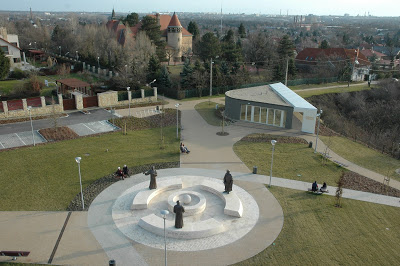 | Kulturális egység: a Sashalmi Református Egyházközség temploma a kis torony, a kert vége a Reformátorok terére és a szoborcsoportra néz. |