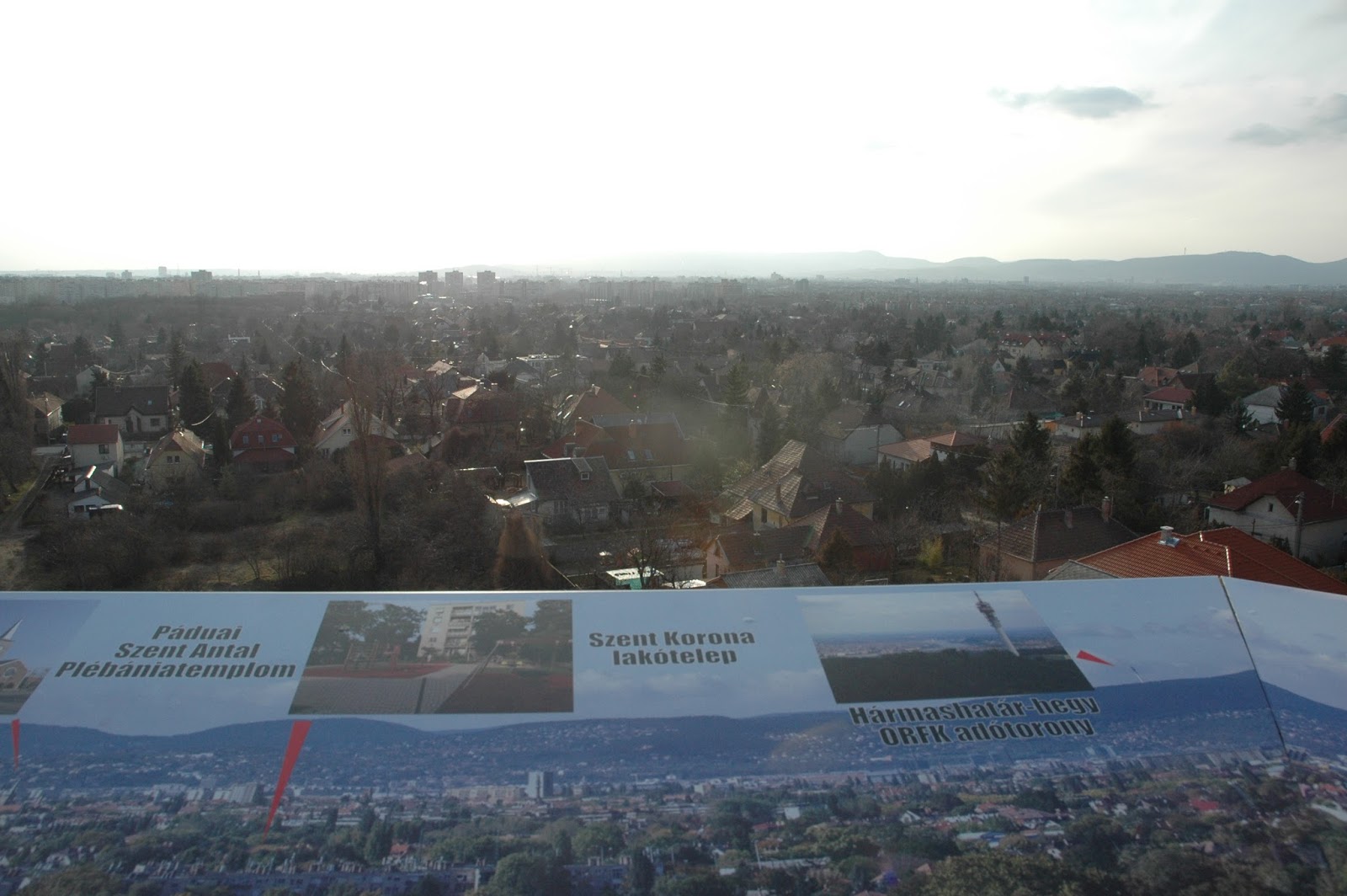 Odafentről belátni Budapest igen nagy részét: közelebbi érdekesség például a Repülőtér irányítótornya, másik irányban a nem olyan távoli Megyeri-híd jellegzetes pilonjai, de látni a Bazilika kupoláját, a Várat, a Gellért-hegyet (hú, milyen pici a János-hegyhez képest)!