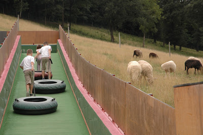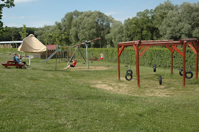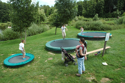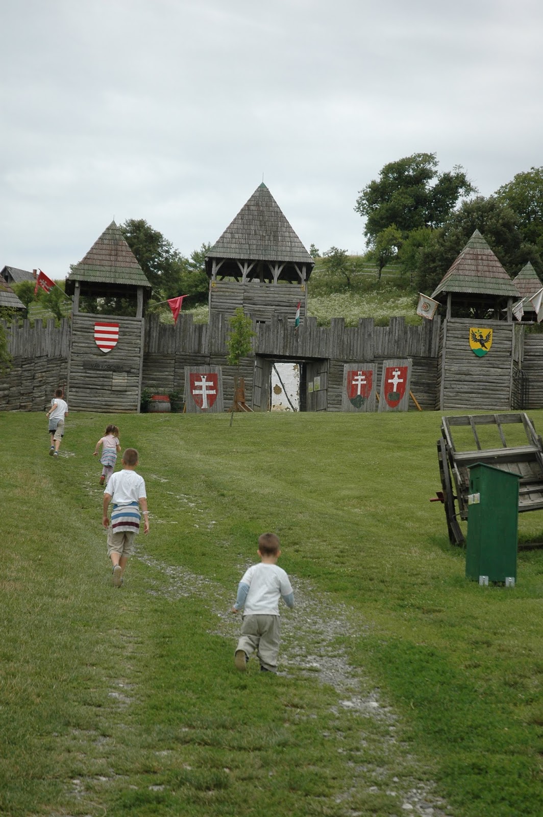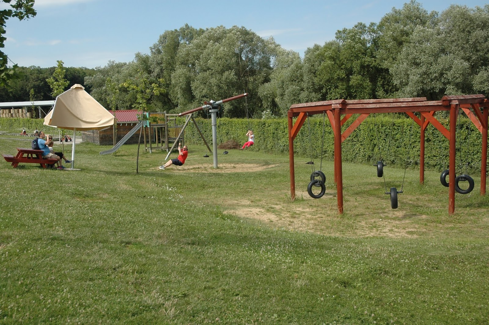 Úgy gondoltuk, hogy teszünk egy kört kint, mielőtt a nagy, beltéri játszóházat felfedezzük, mert volt bennünk egy olyan érzés, hogy onnan egészen biztosan nem tudjuk majd kicsalogatni időben a gyerekeket. Ezért azt találtuk ki, hogy sétálunk kint egy nagy kört, látunk, amit látunk, majd ebéd előtt 30-40 perccel bevesszük a játszóházat, mert nálunk az ebéd az egy csalogató tényező. 🙂 Ez a taktika bejött. Addig láttuk és kipróbáltuk a kültéri trambulint, a különleges homokozókat, a falusi járműveket, és a palánkvárat.