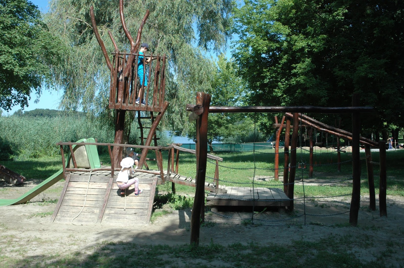Fa játszótér a Deseda strandján. A háttérben jól látható zöld kordonnal elzárták a vizet a strandolók elől! Aznap min. 32 fok volt, július elejét írtunk. |