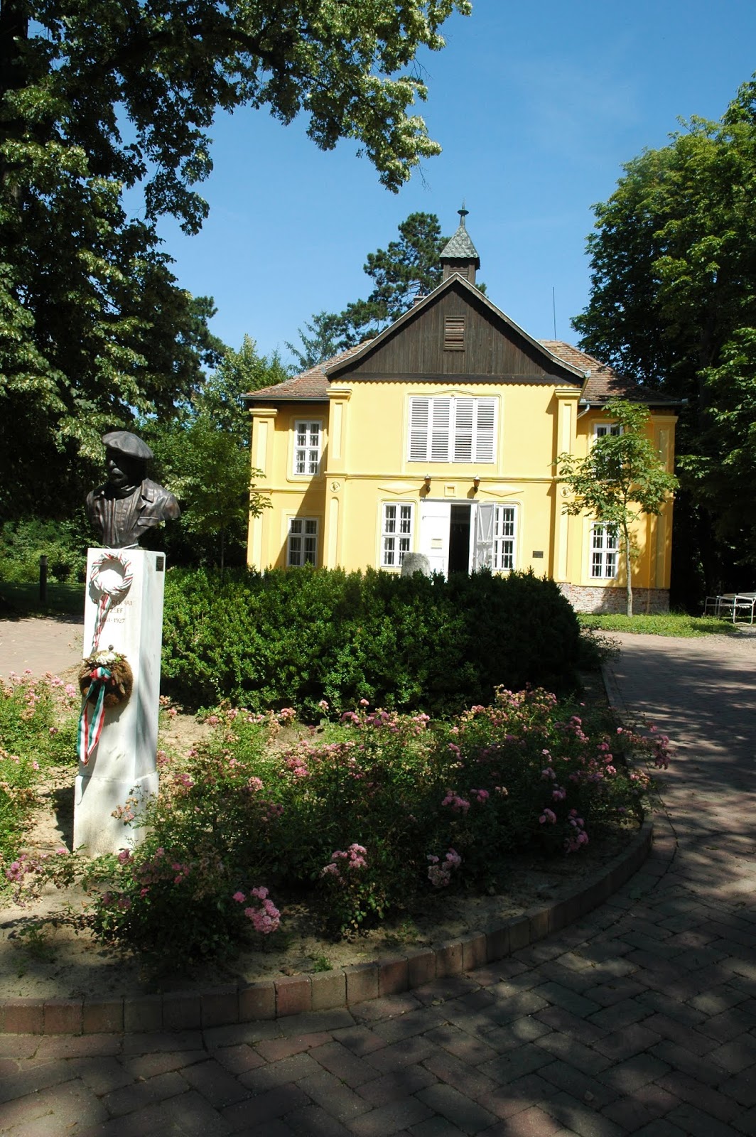 | A bizonyos bronzszobor, melyre halála előtt az említett néni adta a pénzt. Háttérben a felújított emlékház. |