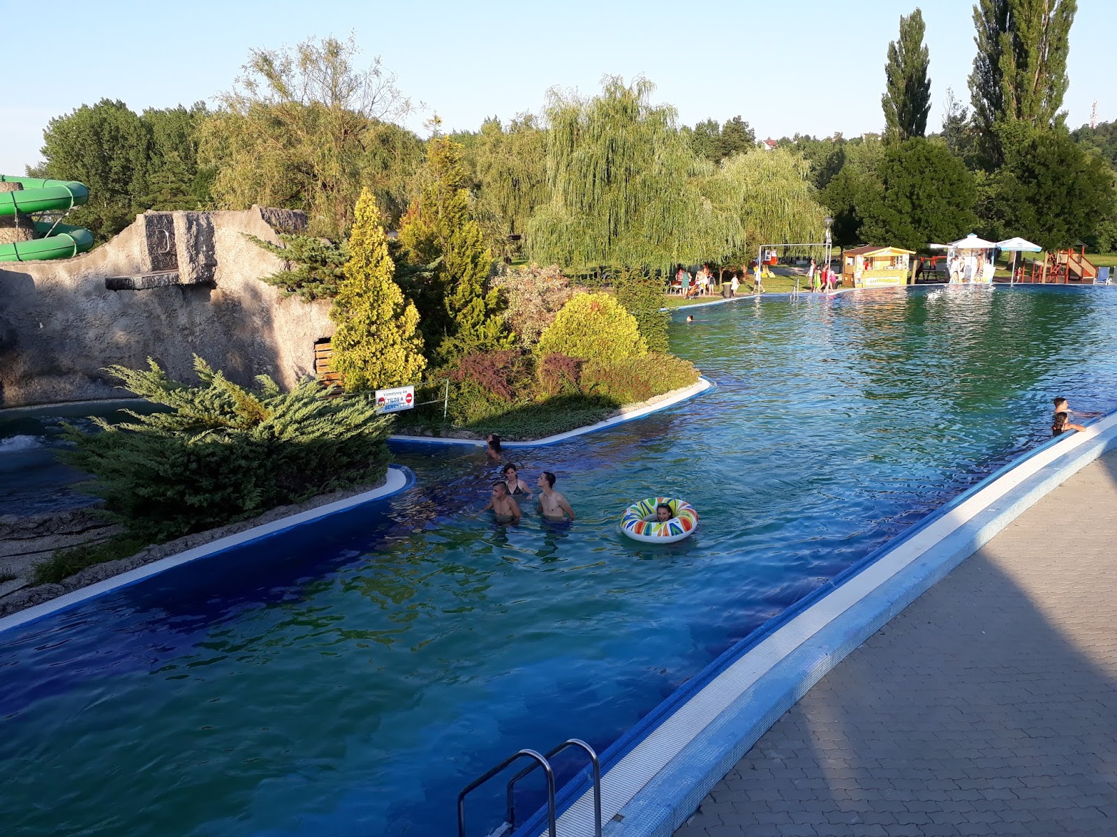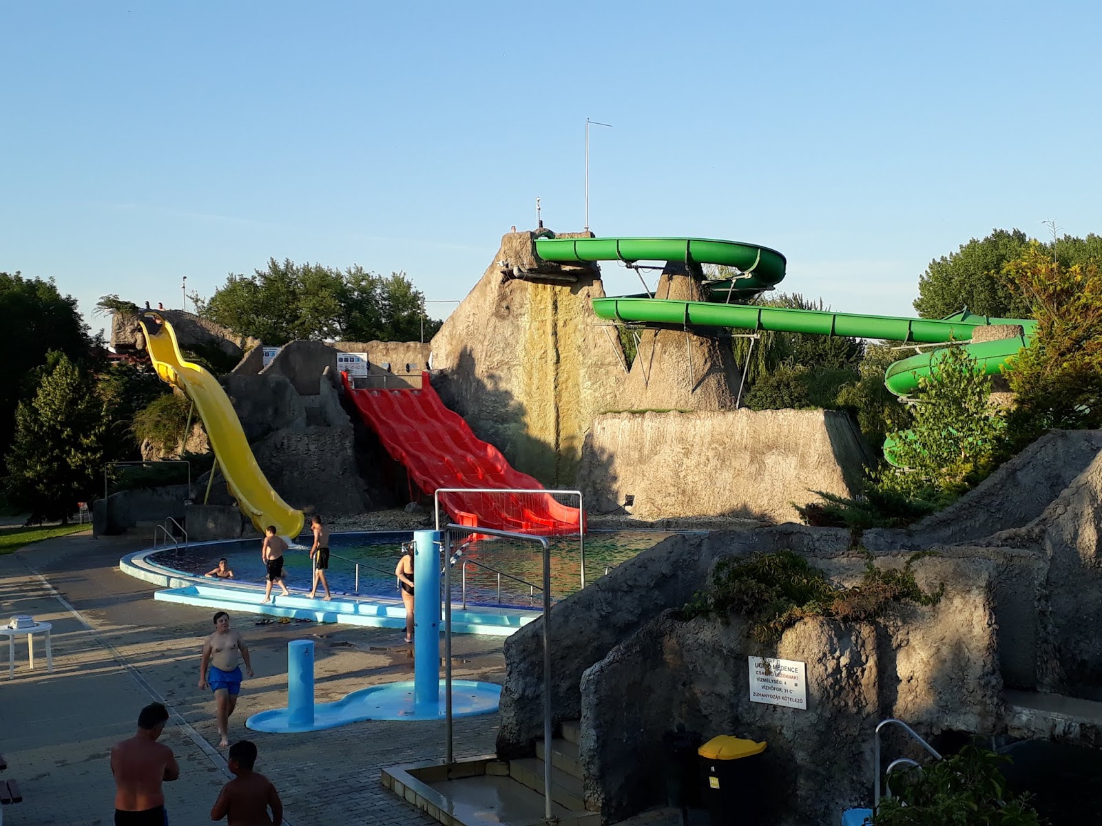 Van óriáspalacsinta, fagyi, jégkrém, és egy étkezde is a nagycsúszdák mögött. Hát… itt a kínálat erősen a mélyhűtött-frissensült kombináció felé tendált, szinte kizárólag. Szerencsénkre egy gyerekcsapat után maradt a nekik szánt menüből, így kedvező áron ehettünk “normális” ételt aznap.