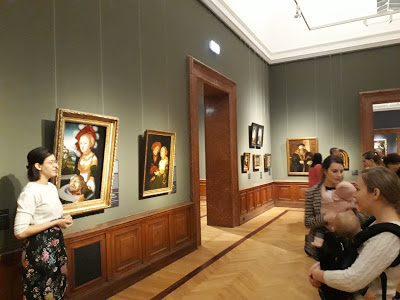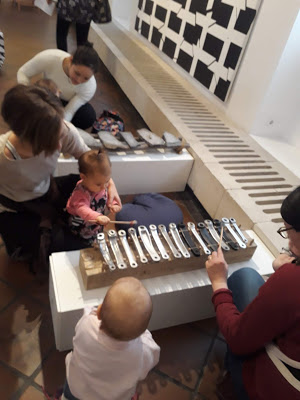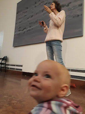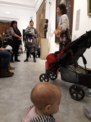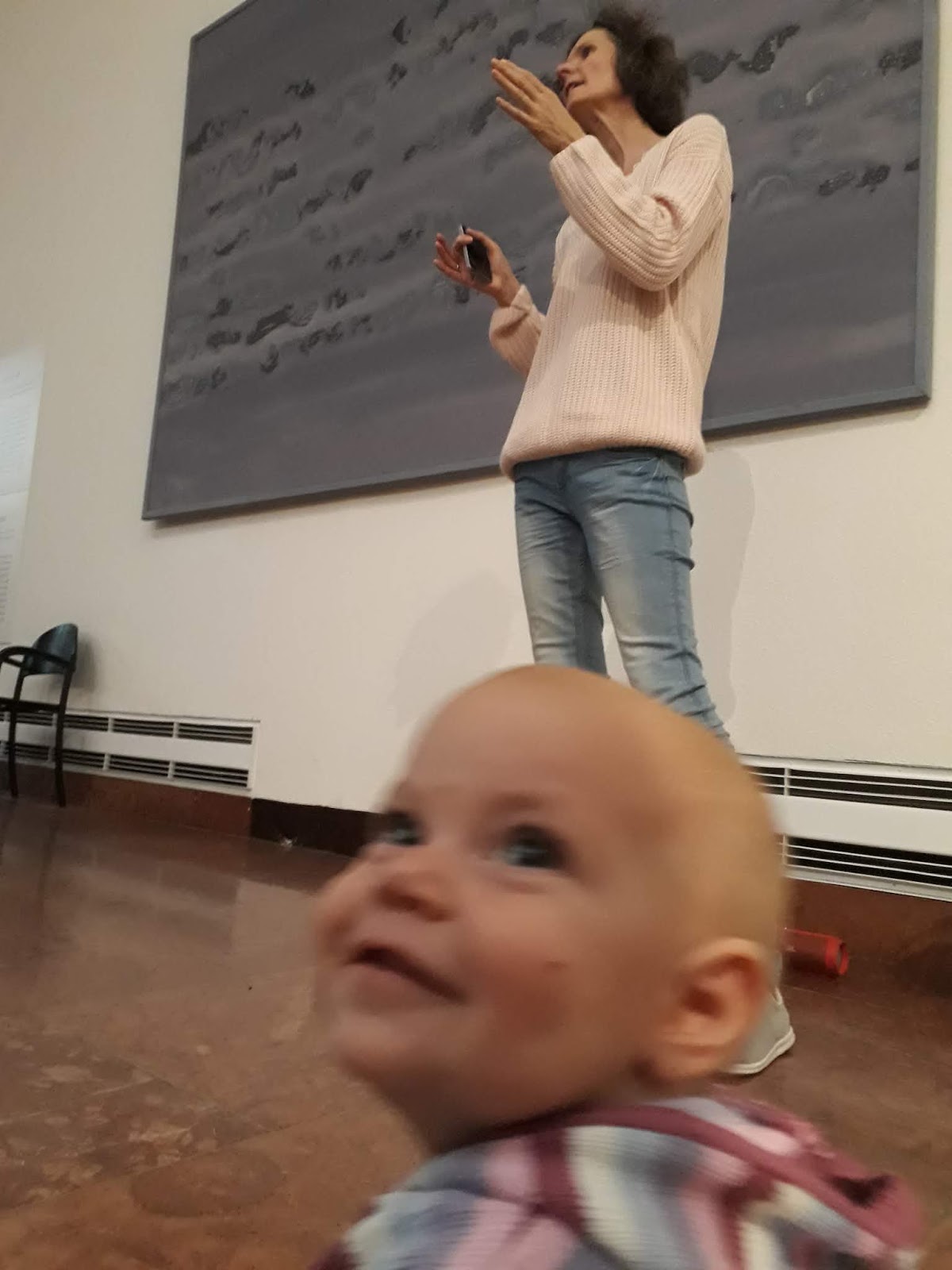 Az októberi programot Koós Nikolett múzeumpedagógus vezette, a választott képeken átívelő témának a zenét hozta. Nem volt könnyű dolga, a mintegy nyolcvan (!!) összegyűlt édesanyának, apukának, nagymamának, barátnőnek és persze a babáknak csak röviden, tömören, érthetően – és persze nagyon hangosan tudott, kellett beszélni egy-egy alkotásról. Összefoglalóit zenei kísérettel nyitotta vagy zárta, ez az ötlet különös hangulatot adott az amúgy is lélekemelő “túrának”. Régen voltam a Galériában, ezért számomra önmagában a szebbnél szebb képek közötti séta is feltöltő volt, hát még a ZENÉS kíséret és az elgondolkodtató információk!