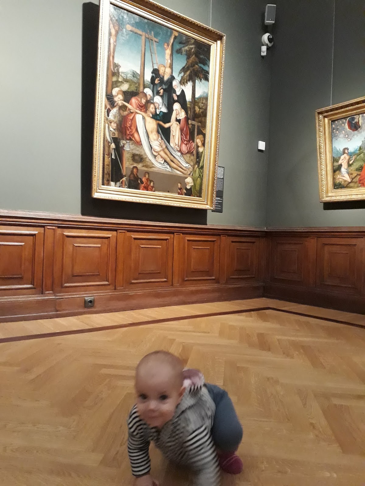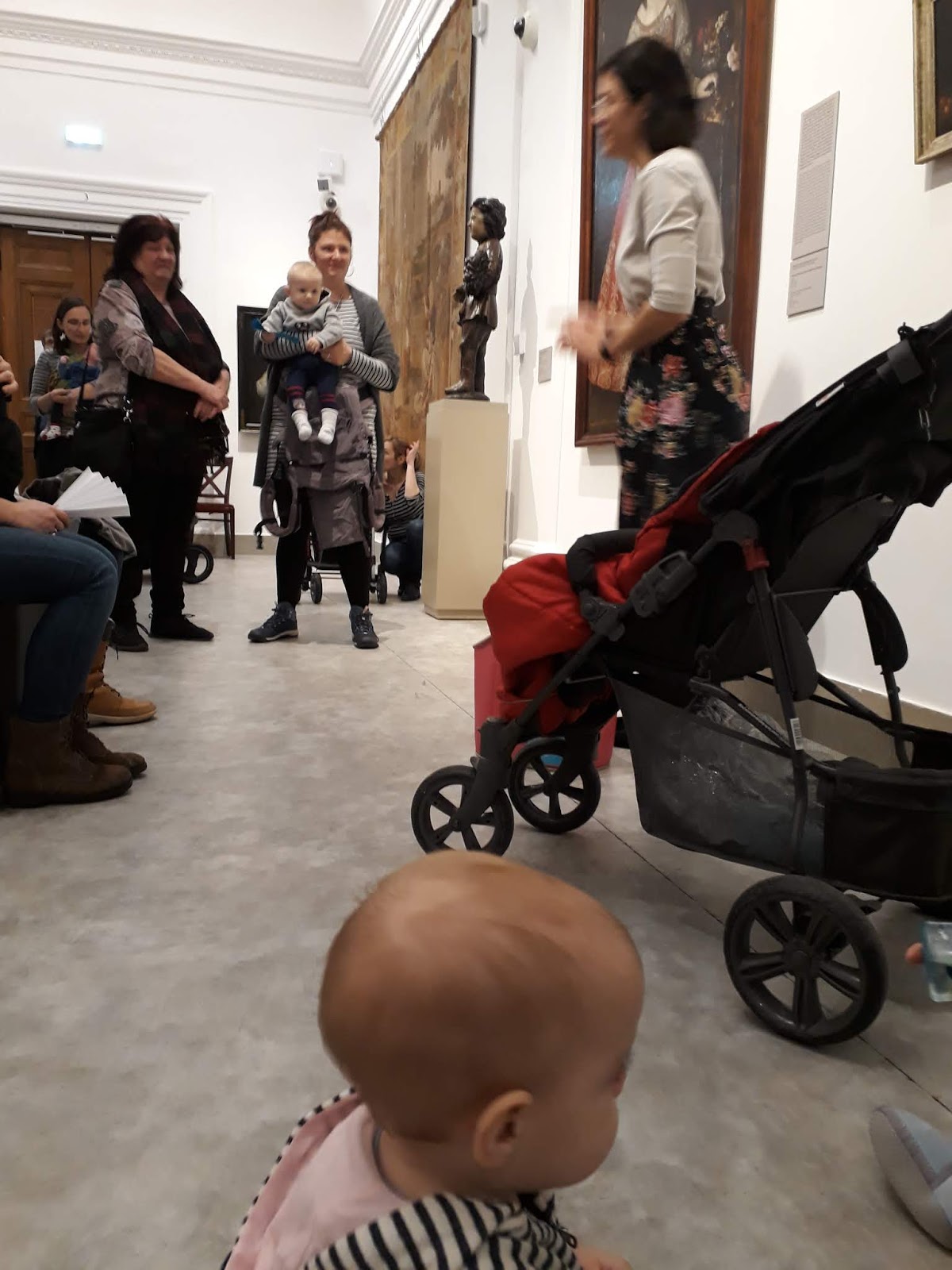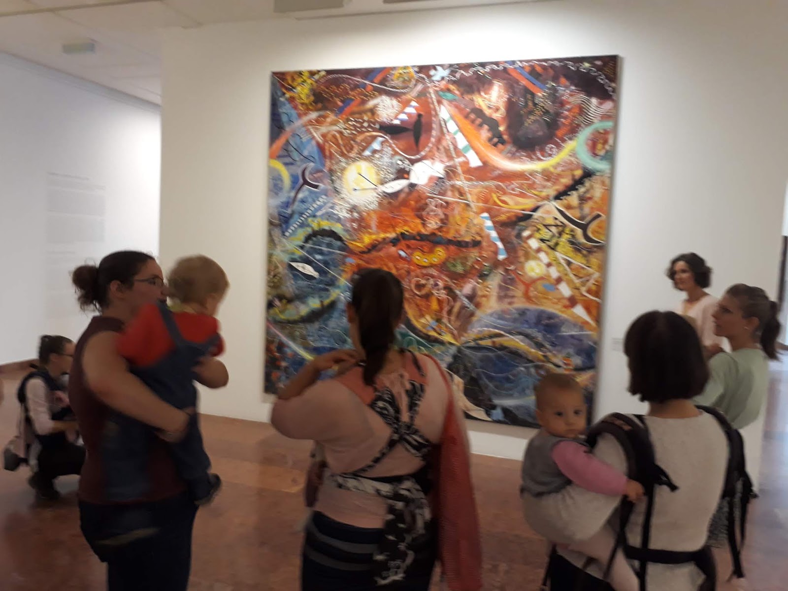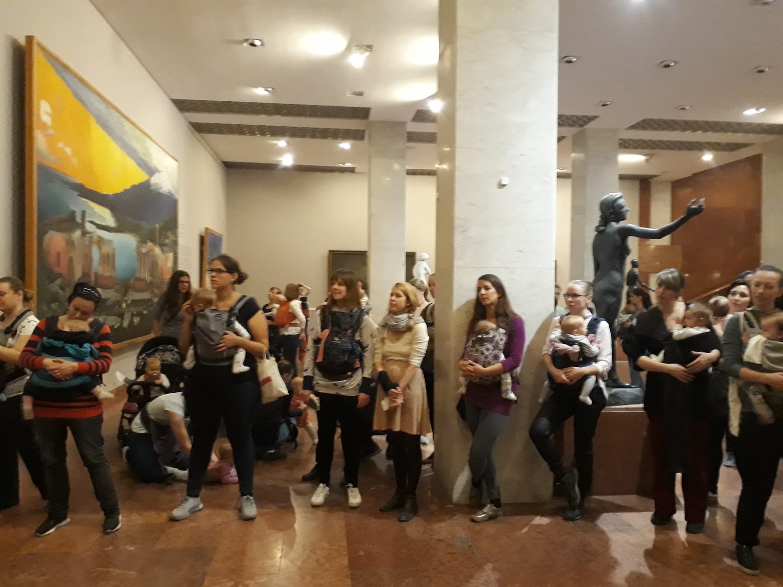 Akkor még javában futott a Frida kiállítás, ami miatt hatalmas tömeg volt az aulában, nagy sor a pénztáraknál. Mivel a buszom dugóba került a belvárosban, éppen hogy csak megérkeztünk babámmal az utolsó pillanatban, szó szerint futottam a hegyodalon felfelé a Clarck Ádám térről. Lihegve váltottam meg a jegyet, amit csak azért sikerült időben megvásárolnom, mert nyitottak egy külön pénztárt a babás anyukáknak. A ruhatárban kissé morcos nénik nem tudtak mit kezdeni a sok anyuka hirtelen felmerült igényeivel, a babakocsik kesze-kuszaságban álltak itt-ott – ezzel szerencsére nem kellett foglalkoznom, mivel csatos hordozóban cipeltem a kislányomat. Akik egyáltalán nem rakták át hordozóba gyermeküket, kimaradtak néhány műalkotásból, mert nem emelgették a babakocsikat a félemeletekre – ahová a Galériában nem visz lift.