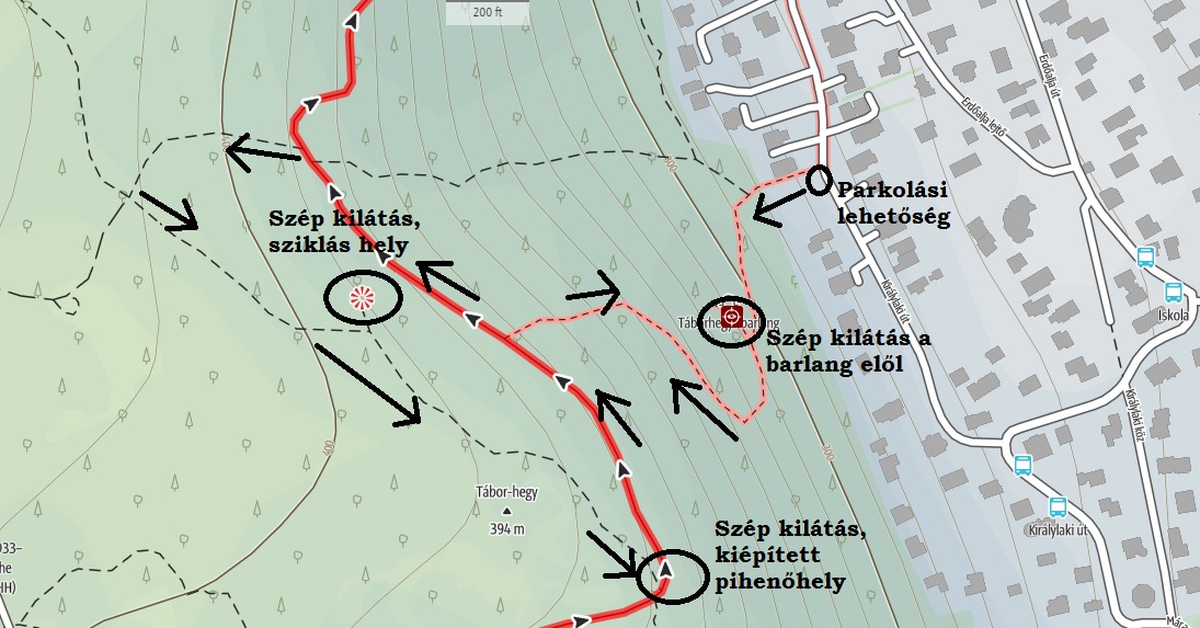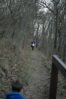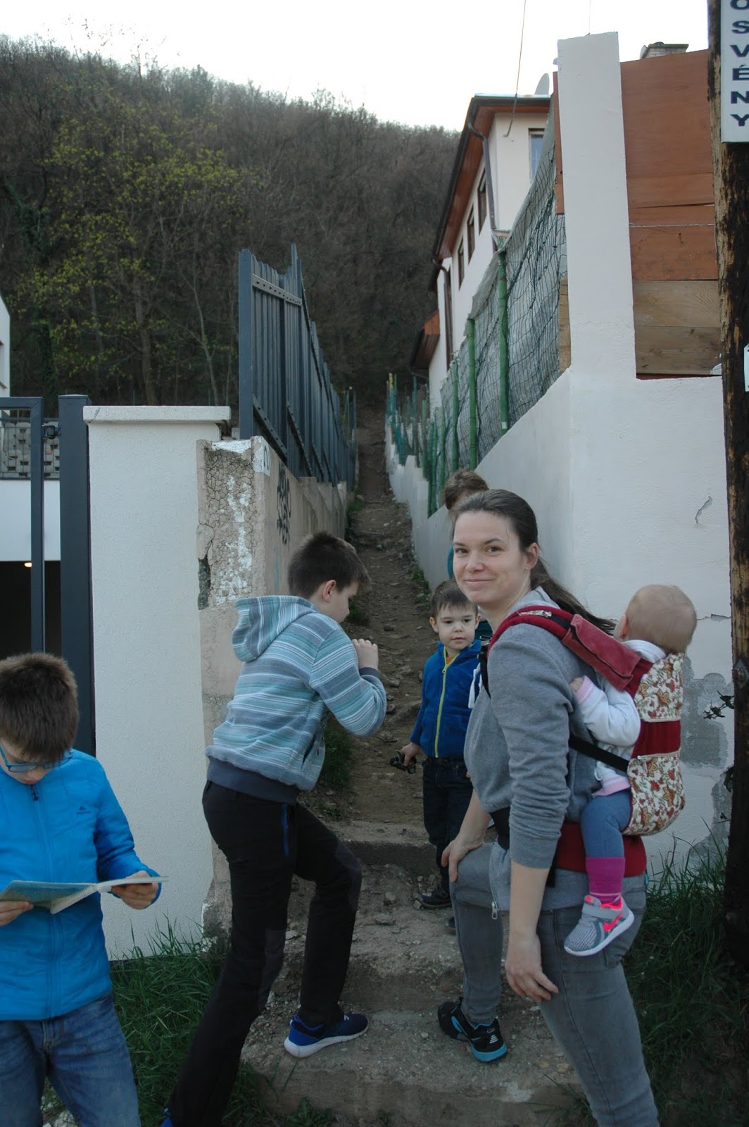 Egészen pontosan a III. kerület, Királylaki út 31. számú ház kapujával szemben van egy szó szerint alig két embernyi széles, éppen csak észrevehető ösvényke, “lépcső”, amely felvezet a Tábor-hegyi barlanghoz vezető útra, majd tovább felfelé a tanösvény szintjére. Itt hagytuk az autót – volt hely bőven, szépen meg lehetett állni aznap – s elindultunk felfelé a kaptatón.