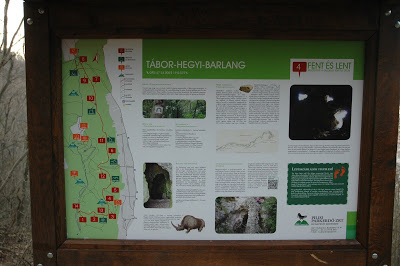 Utána meredeken felfelé gyalogolva elértük az első, (később kiderült ezen a napon az egyetlen) általunk érintett tanösvény táblát, ami éppen a Tábor-hegyről és a barlangról szólt.