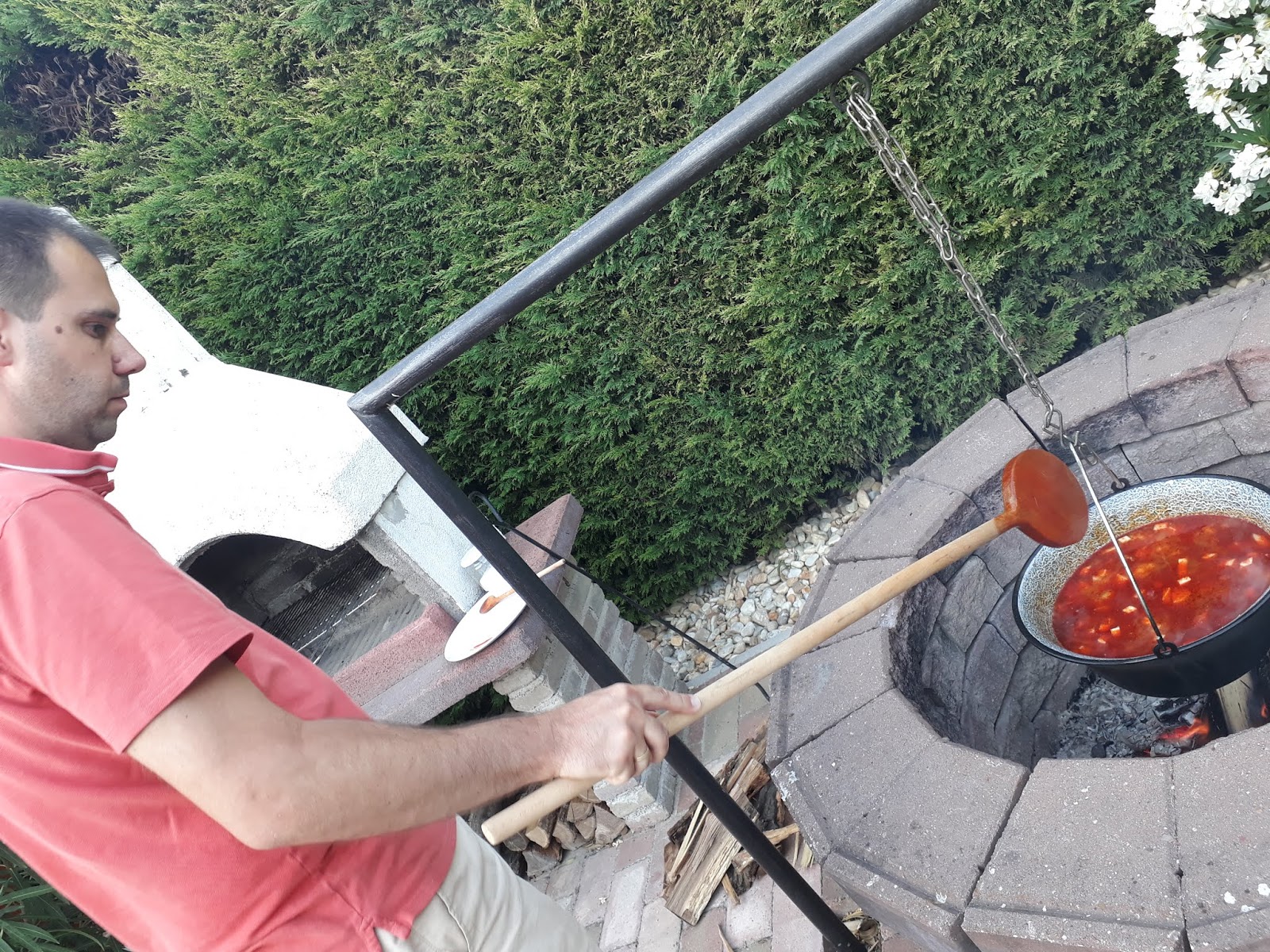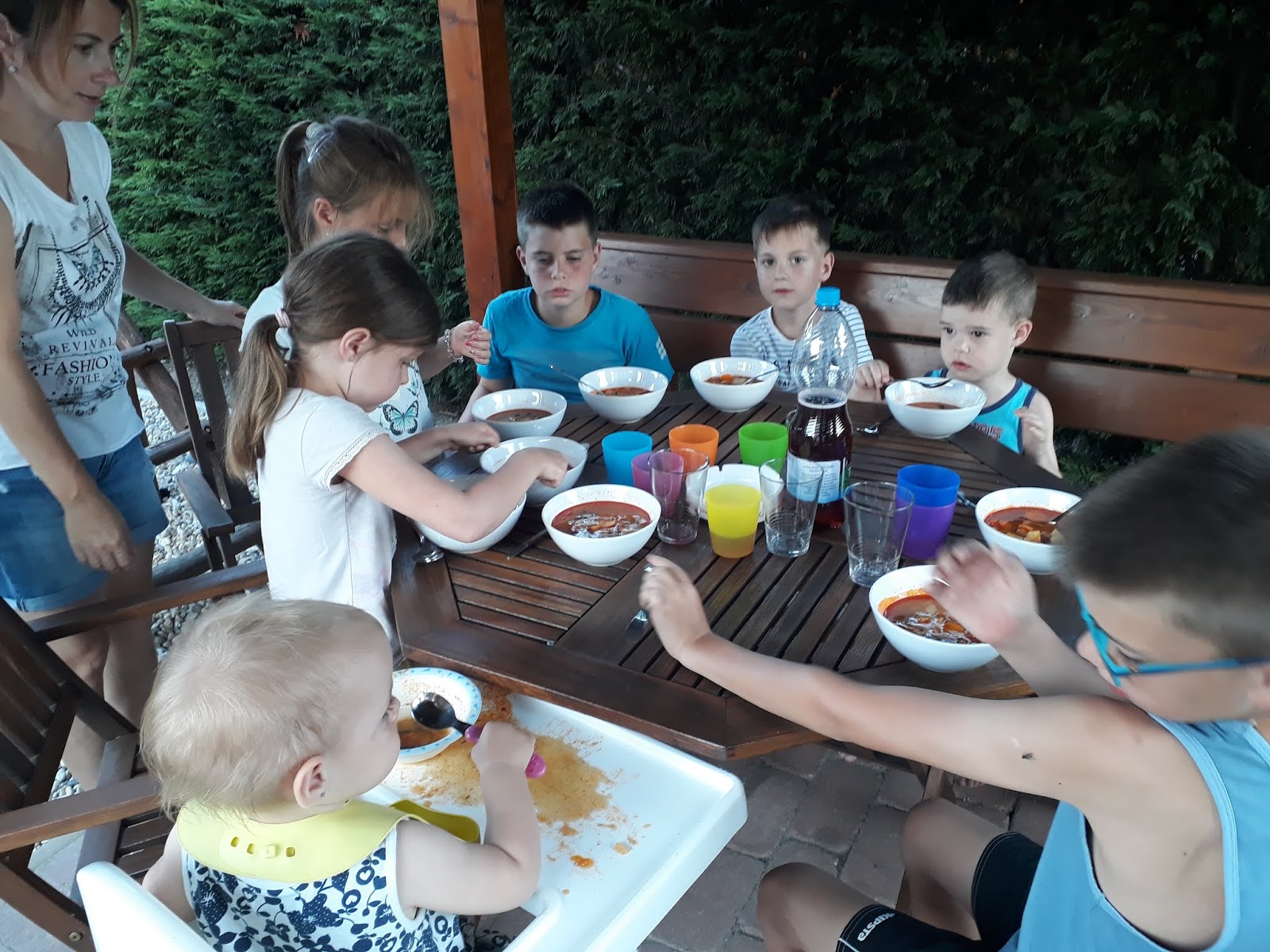 Kettővel megszaporodott gyerekseregünk boldogon lapátolja a gulyást. (Előző nap házigazdáink, Anikó és Szabolcs vendégeltek meg minket kemencében sült pizzával! Szabolcs szakács… a pizzája mennyei volt.) |