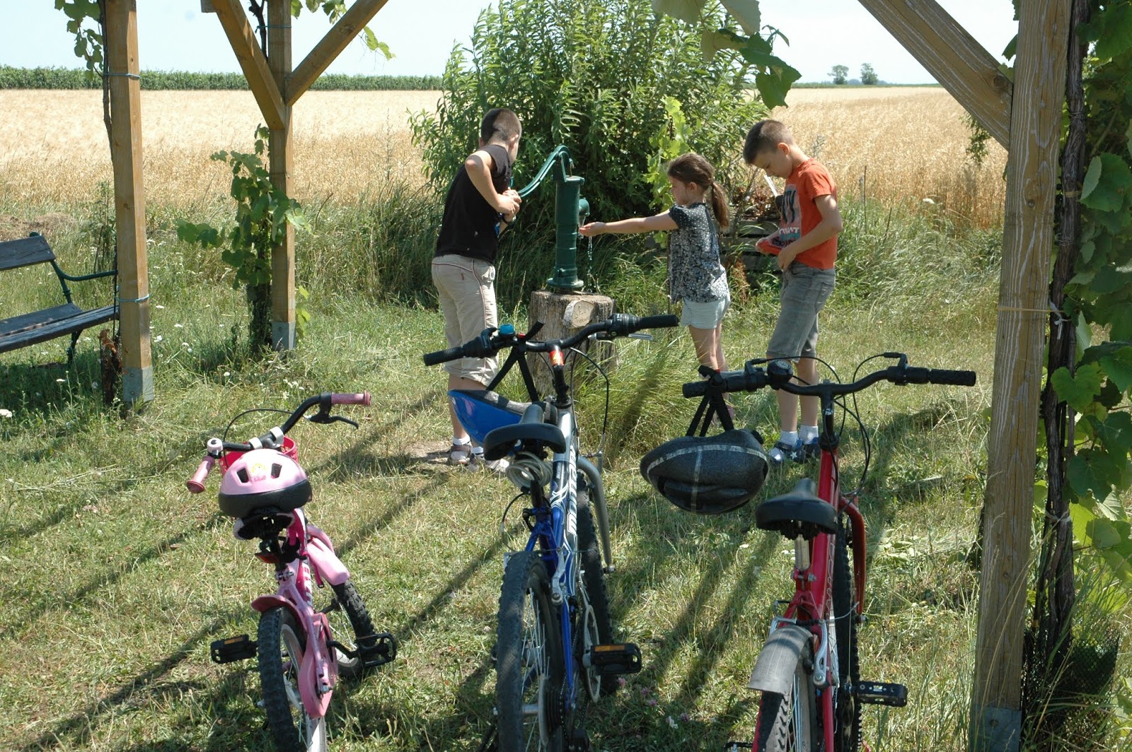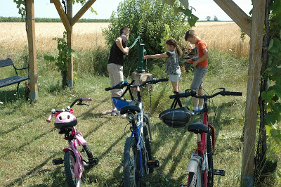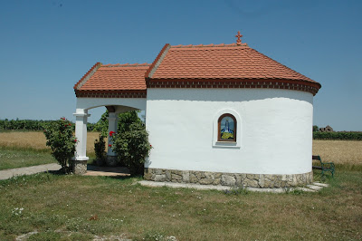Illmitz városában csak röviden tekertünk, utunk a Badesee felé sík, művelt területen haladt. (a B10-es és a B20-as út közös szakaszán) Egy kis kápolna mellett kút, pad, némi árnyék várja a megfáradt biciklistákat. |