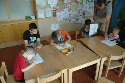 | Elmélyült alkotás a gyereksarokban. A kész remekműveket a táblán hagyhattuk. |